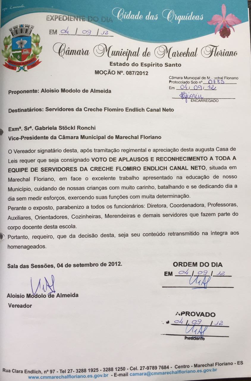 MOÇÃO DE APLAUSOS E RECONHECIMENTO A TODA A EQUIPE DE SERVIDORES DA CRECHE FLOMIRO ENDLICH CANAL NETO.