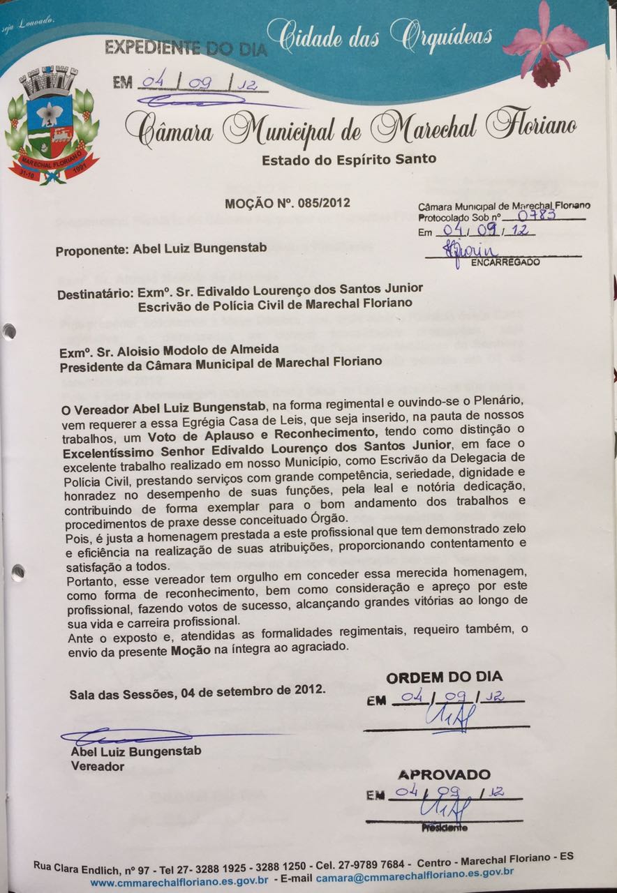 MOÇÃO DE APLAUSOS E RECONHECIMENTO PARA O EXCELENTÍSSIMO SENHOR EDIVALDO LOURENÇO DOS SANTOS JUNIOR.