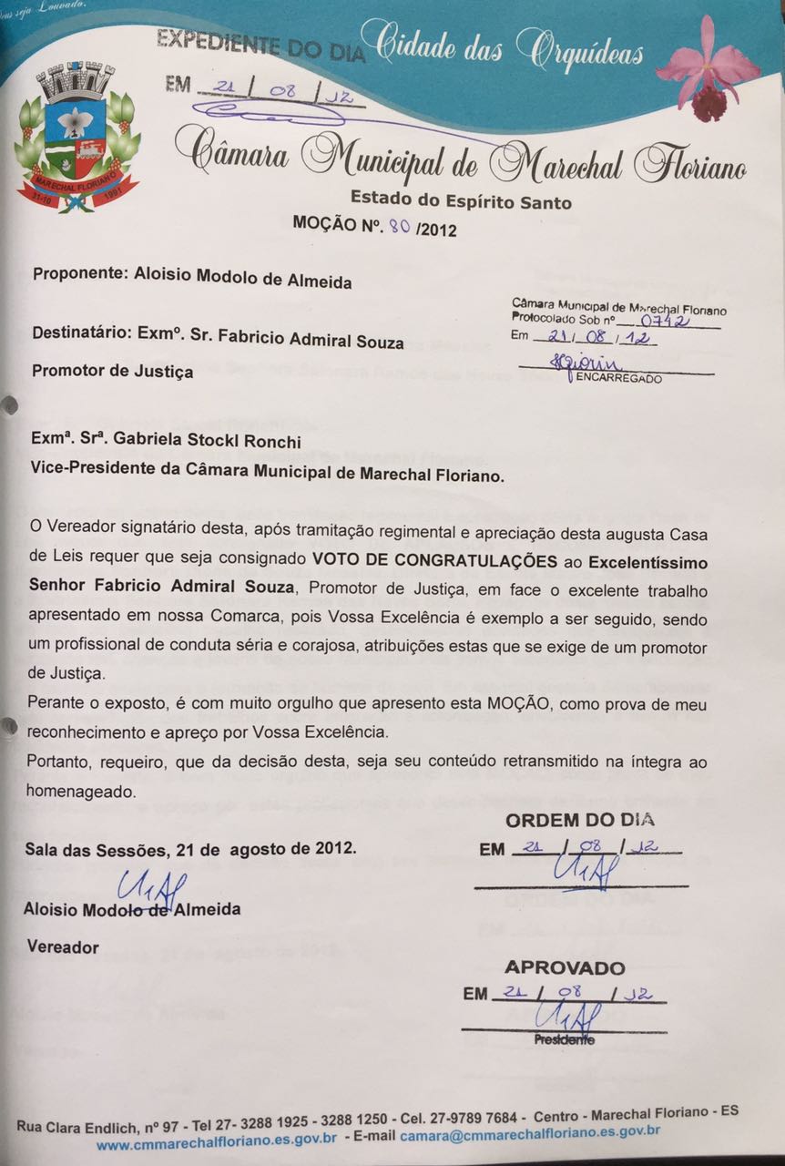 MOÇÃO DE CONGRATULAÇÕES AO EXCELENTÍSSIMO SENHOR FABRICIO ADMIRAL SOUZA.