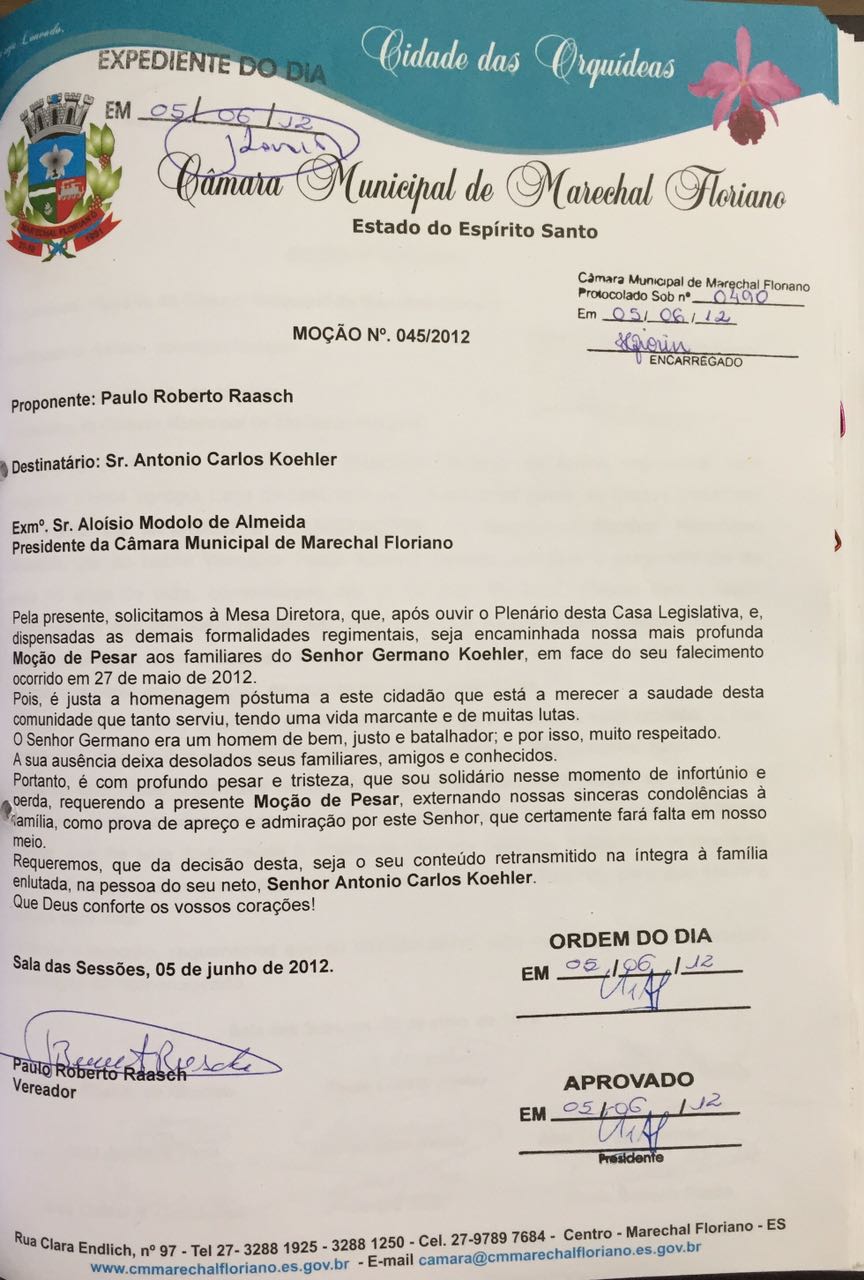 MOÇÃO DE PESAR AOS FAMILIARES DO SENHOR GERMANO KOEHLER, EM FACE DE SEU FALECIMENTO.