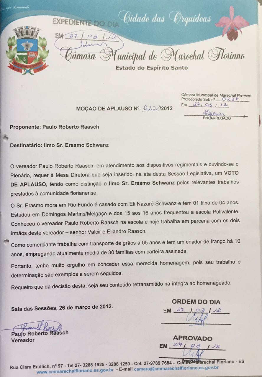 MOÇÃO DE APLAUSO, AO ILMO SR. ERASMO SCHWANZ.