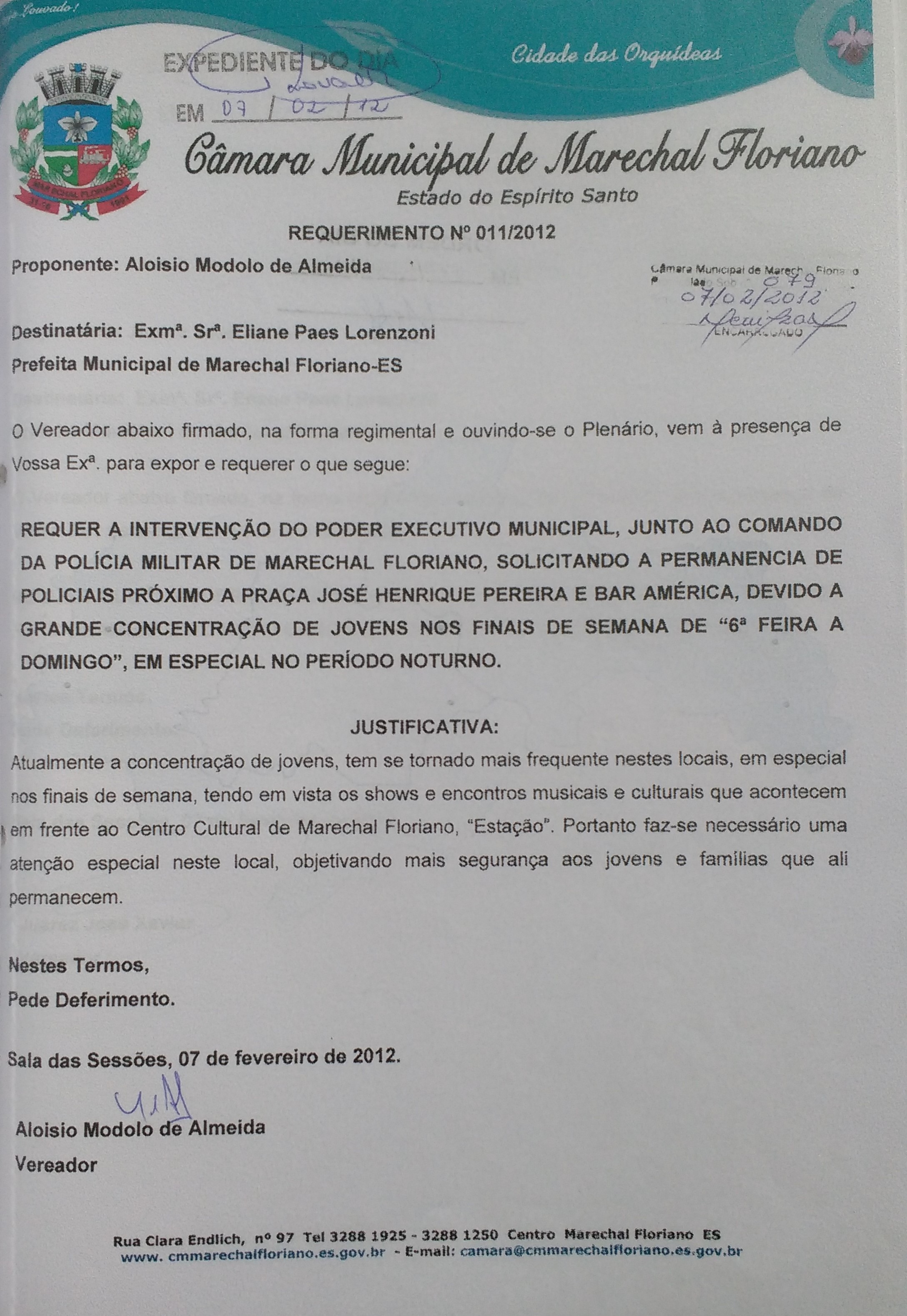 REQUER A INTERVENÇÃO DO PODER EXECUTIVO MUNICIPAL, JUNTO AO COMANDO DA POLÍCIA MILITAR DE MARECHAL FLORIANO, SOLICITANDO A PERMANÊNCIA DE POLICIAS PRÓXIMO A PRAÇA JOSÉ HENRIQQUE PEREIRA E BAR AMÉRICA, DEVIDO A GRANDE CONCENTRAÇÃO DE JOVENS NOS FINAIS DE SEMANA DE "6º FEIRA A DOMINGO", EM ESPECIAL NO PERÍODO NOTURNO.