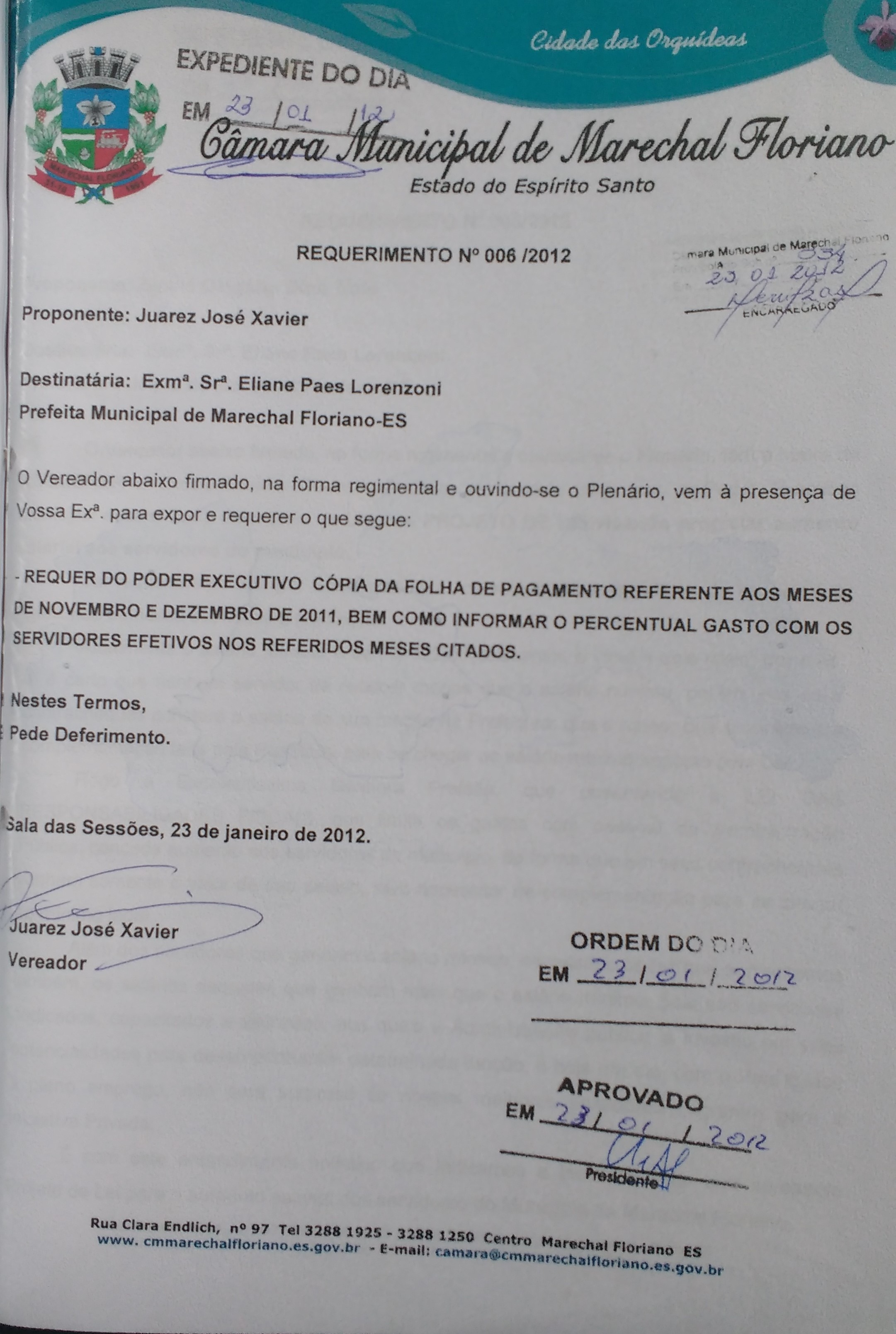 REQUER DO PODER EXECUTIVO CÓPIA DA FOLHA DE PAGAMENTO AOS MESES DE NOVEMBRO E DEZEMBRO DE 2011, BEM COMO INFORMAR O PERCENTUAL GASTO COM OS SERVIDORES EFETIVOS NOS REFERIDOS MESES CITADOS.