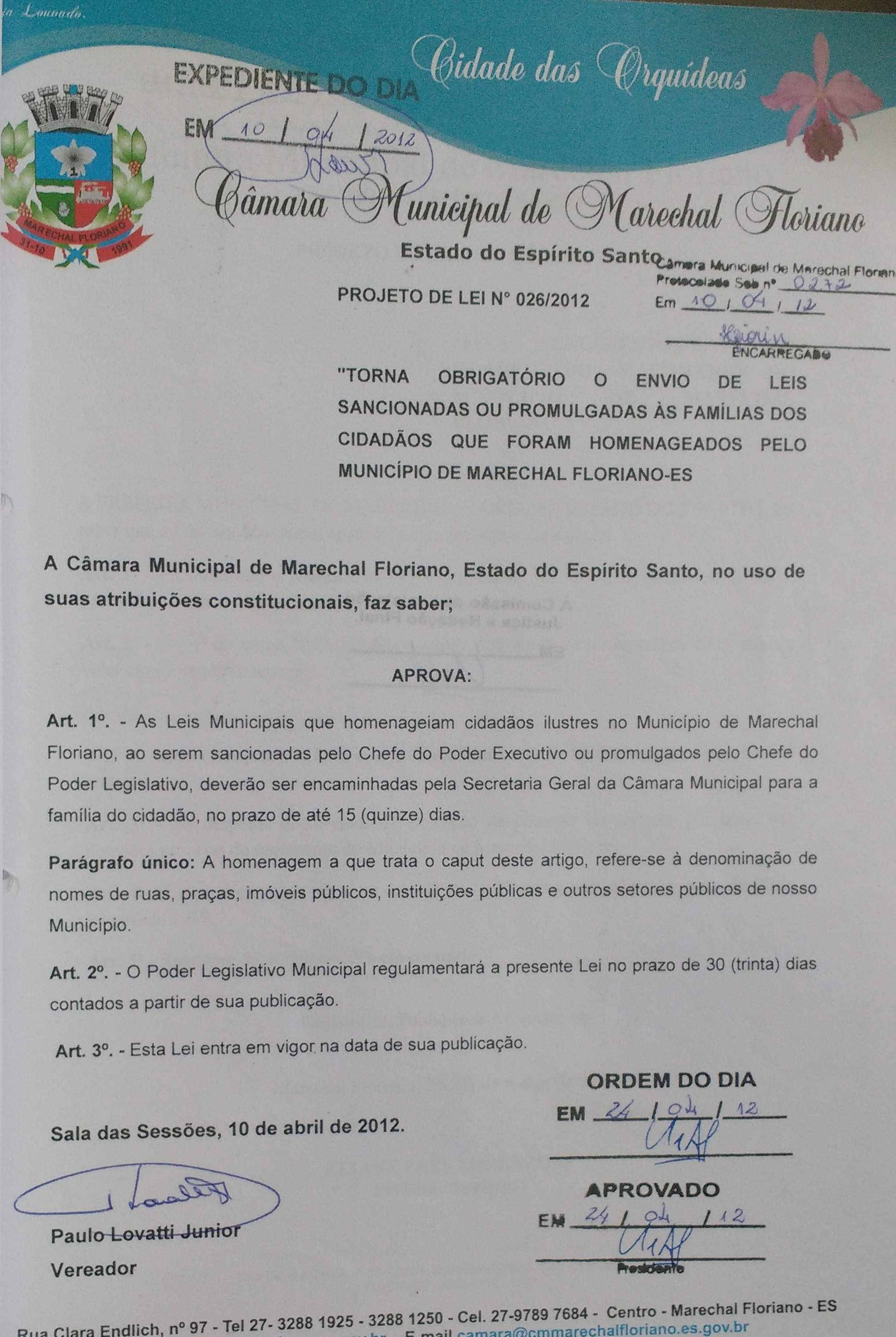 A CÂMARA MUNICIPAL DE MARECHAL FLORIANO, ESTADO DO ESPÍRITO SANTO, NO USO DE SUAS ATRIBUIÇÕES CONSTITUCIONAIS E TOMANDO CONHECIMENTO DO PROJETO DE LEI N°. 026/2012 DE AUTORIA DO VEREADOR PAULO LOVATTI JUNIOR QUE "TORNA OBRIGATÓRIO O ENVIO DE LEIS SANCIONADASOU PROMULGADAS ÀS FAMILIAS DOS CIDADÃOS QUE FORAM HOMENAGEADOS PELO MUNICÍPIO DE MARECHAL FLORIANO-ES".