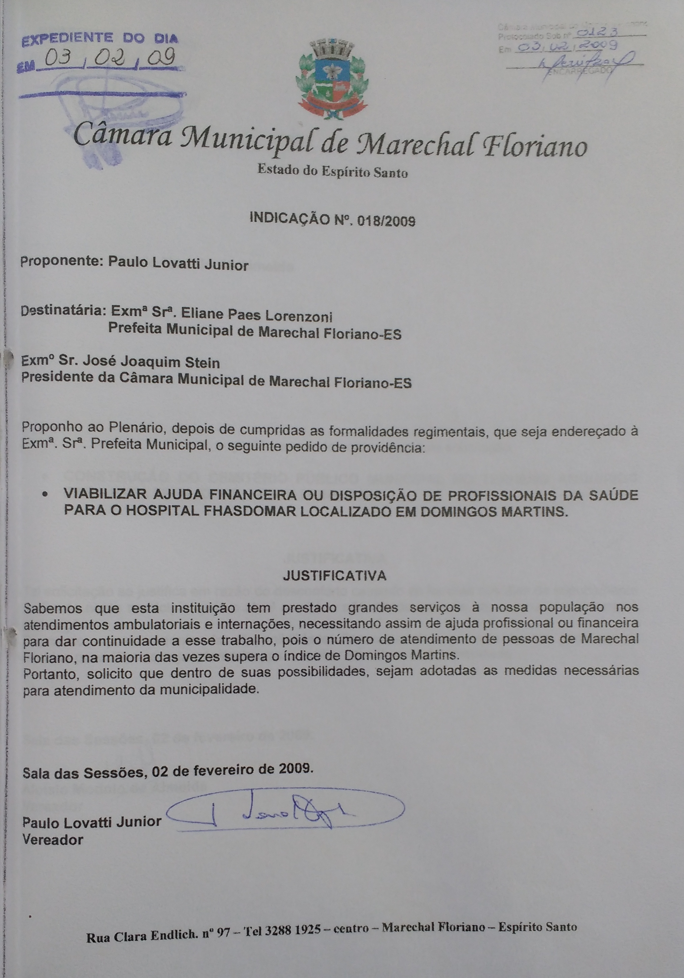 VIABILIZAR AJUDA FINANCEIRA OU DISPOSIÇÃO DE PROFISSIONAIS DA SAÚDE PARA O HOSPITAL FHASDOMAR LOCALIZADO EM DOMINGOS MARTINS.