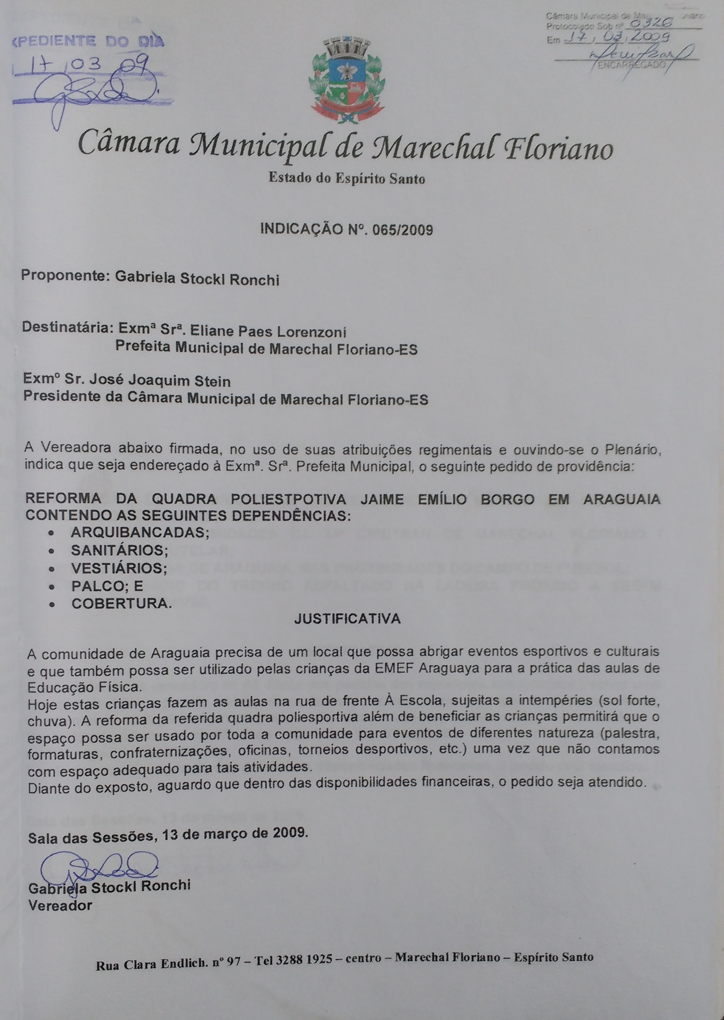 REFORMA DA QUADRA POLIESPORTIVA JAIME EMÍLIO BORGO EM ARAGUAIA CONTENDO AS SEGUINTES DEPENDÊNCIAS: