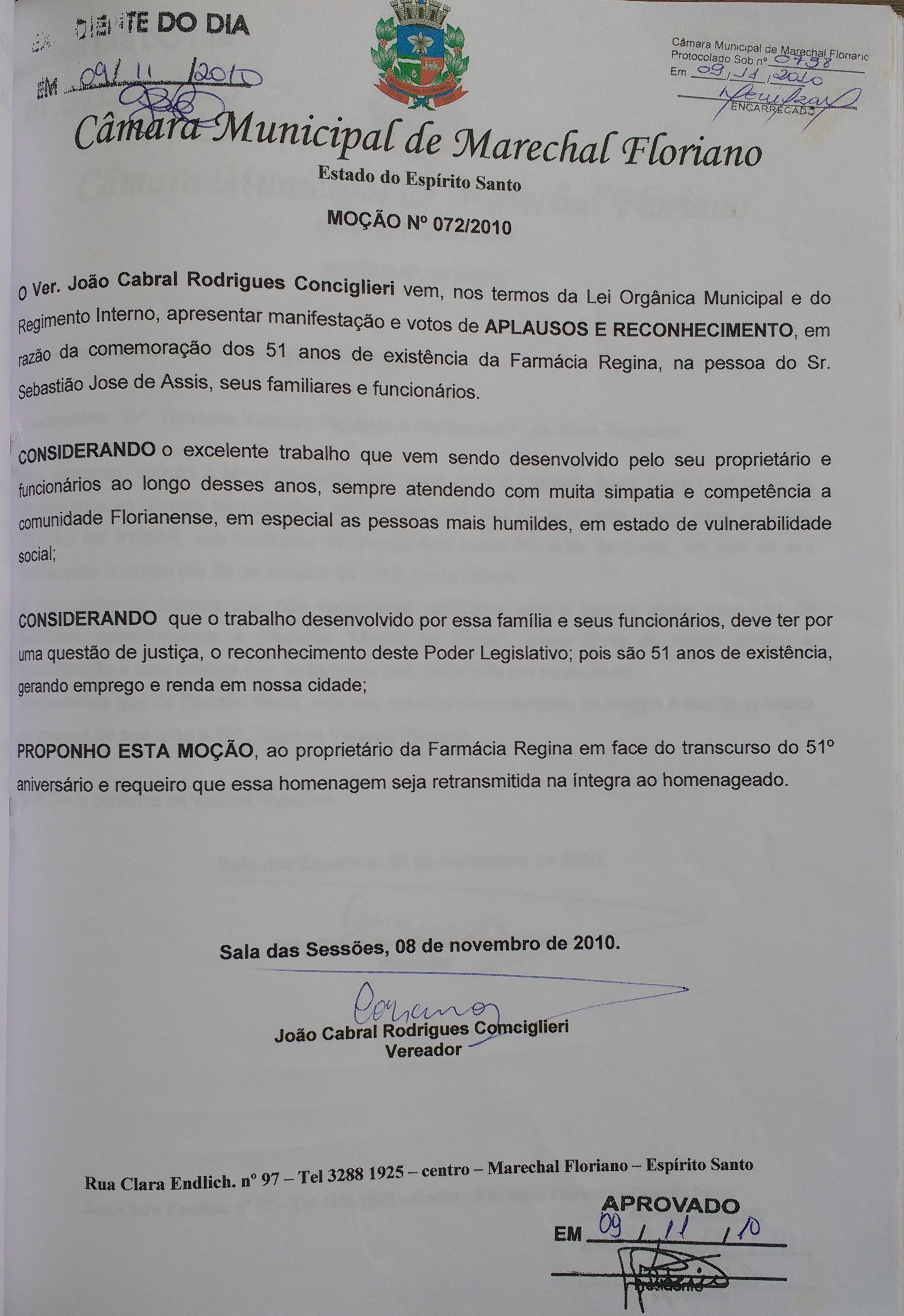 VOTOS DE APLAUSOS E RECONHECIMENTO EM COMEMORAÇÃO A 51 ANOS DE EXISTÊNCIA DA FARMÁCIA REGINA