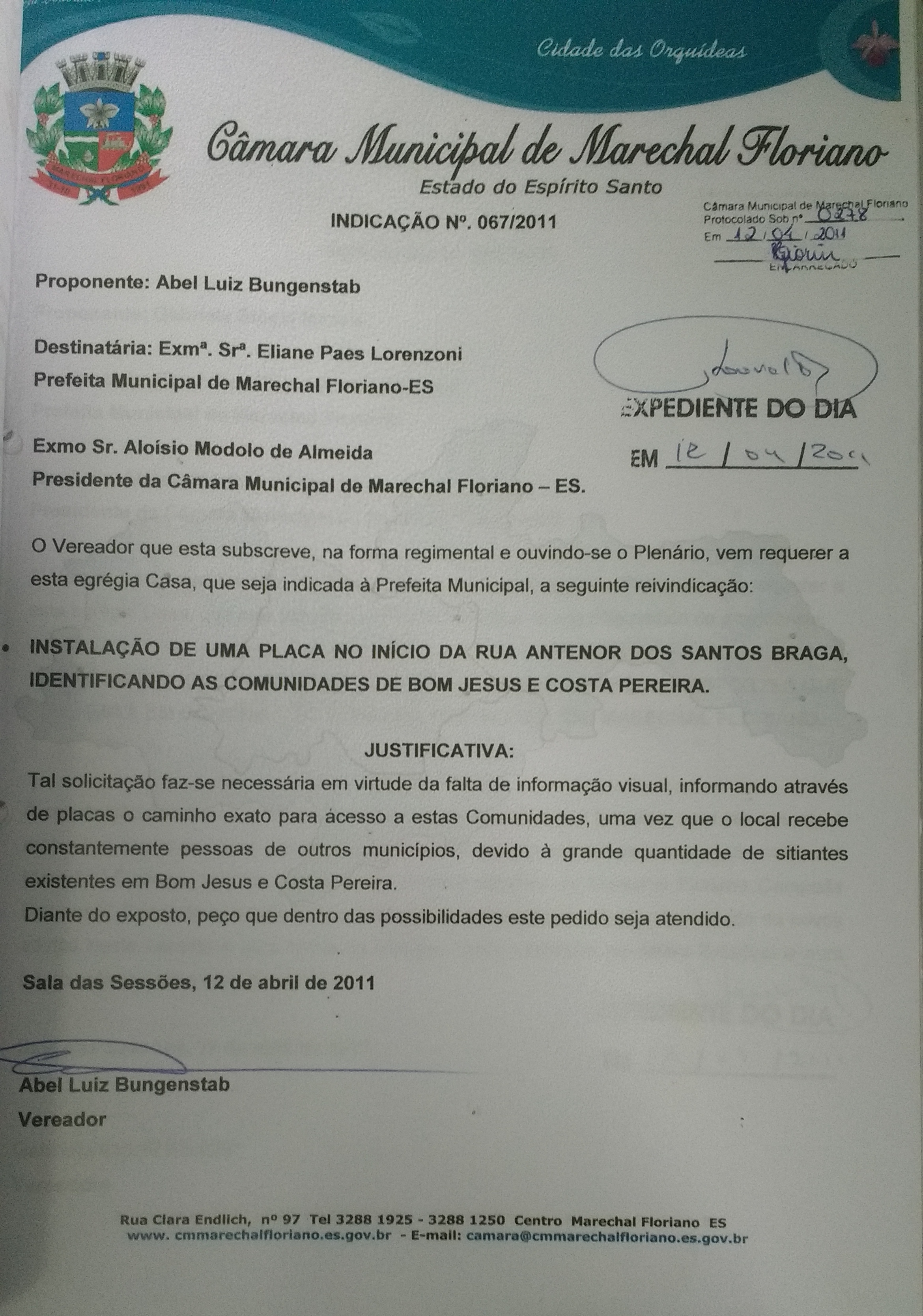 INSTALAÇÃO DE UMA PLACA NO INICIO DA RUA ANTENOR DOS SANTOS BRAGA, IDENTIFICANDO AS COMUNIDADE DE BOM JESUS E COSTA PEREIRA.