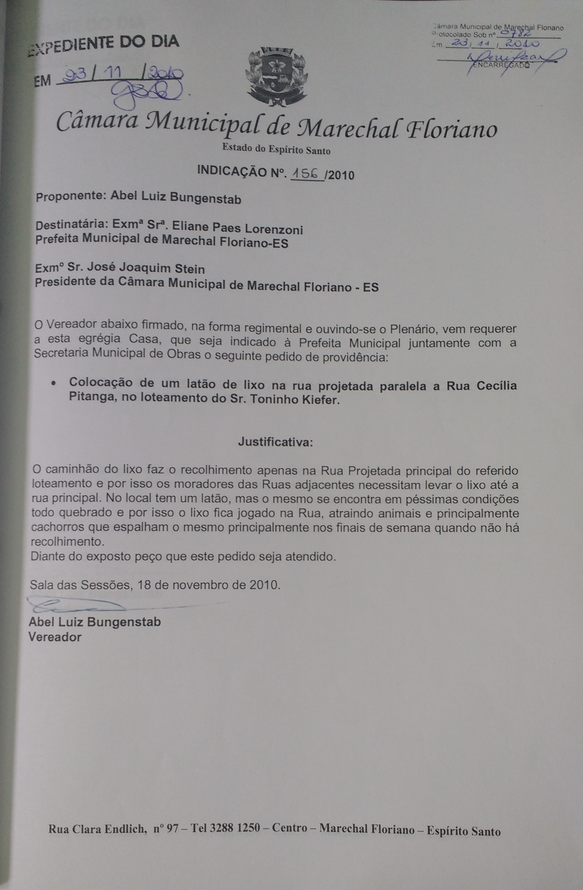 COLOCAÇÃO DE UM LATÃO DE LIXO NA RUA PROJETADA PARALELA A RUA CECÍLIA PITANGA, NO LOTEAMENTO DO SR. TONINHO KIEFER