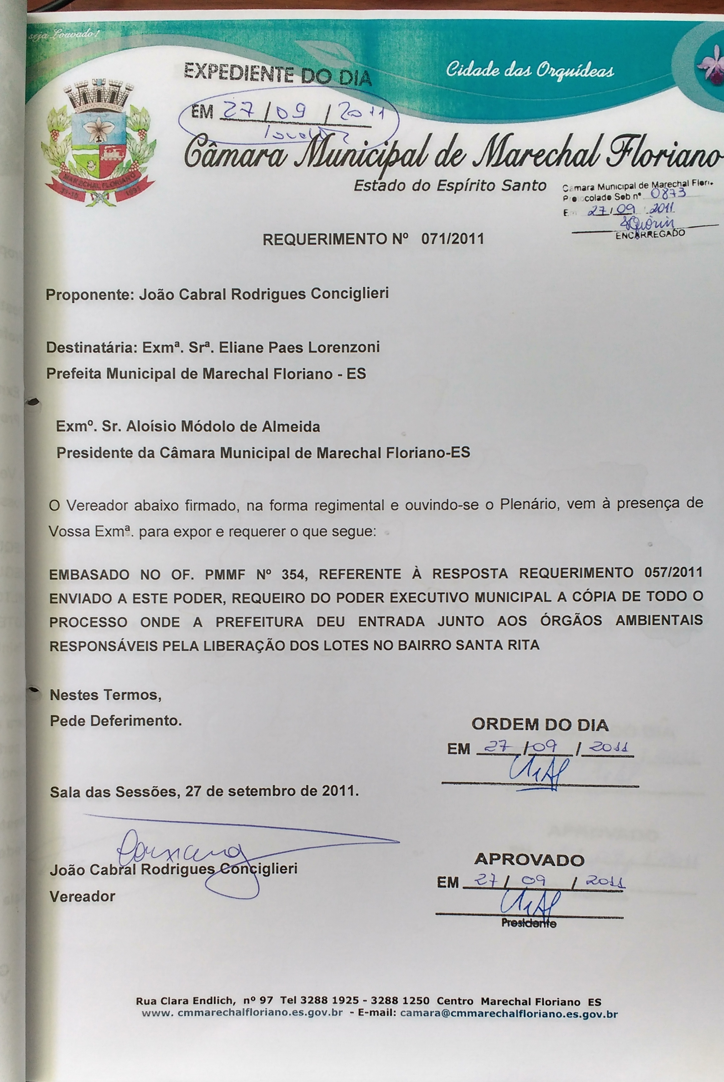 EMBASADO NO OF. PMMF N° 354, REFERENTE À REPOSTA REQUERIMENTO 057/2011 ENVIADO A ESTE PODER, REQUEIRO DO PODER EXECUTIVO MUNICIPAL A CÓPIA DE TODO O PROCESSO ONDE A PREFEITURA DE ENTRADA JUNTO AOS ÓRGÃOS AMBIENTAIS RESPONSÁVEIS PELA LIBERAÇÃO DOS LOTES NO BAIRRO SANTA RITA.