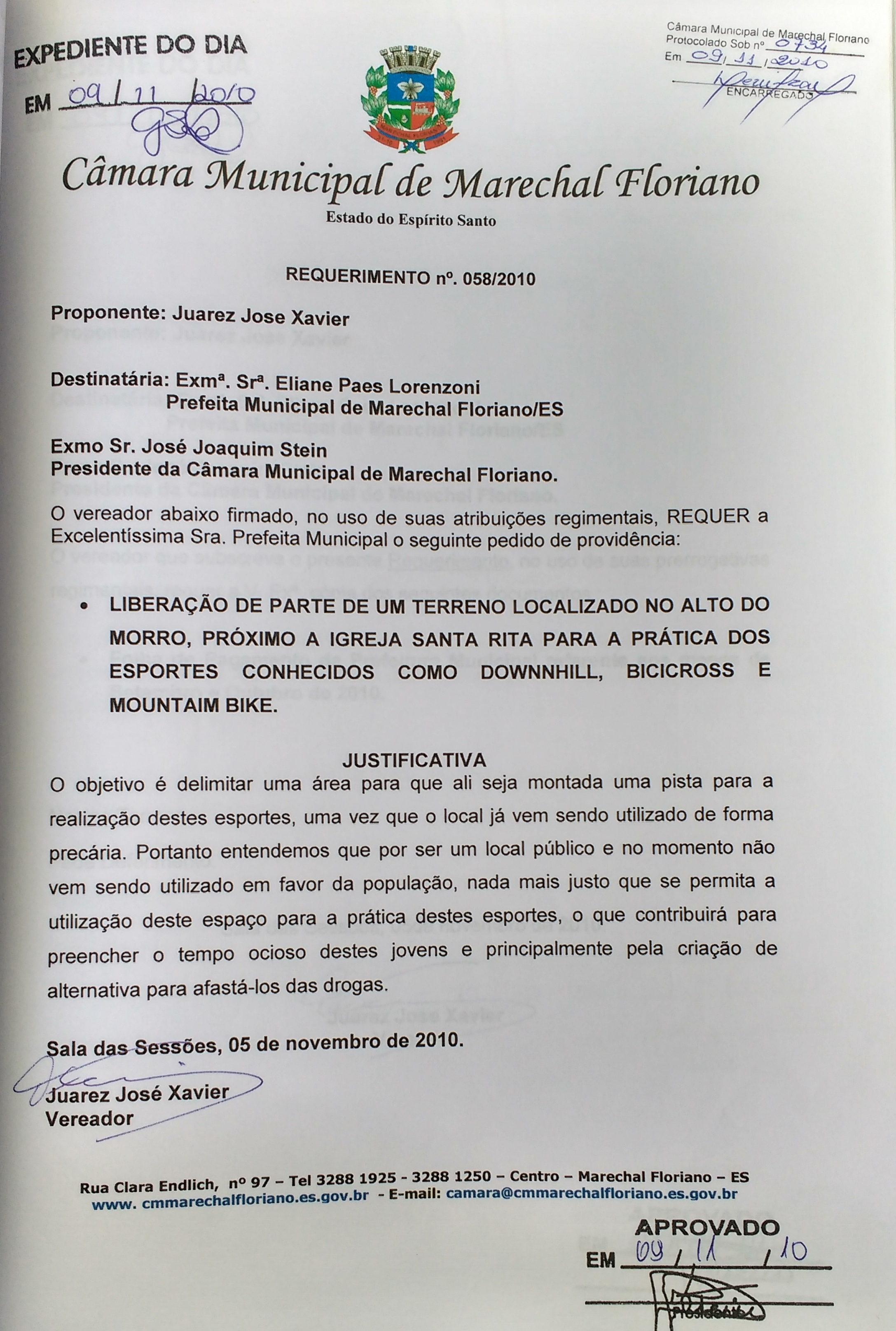 LIBERAÇÃO DE PARTE DE UM TERRENO LOCALIZADO NO ALTO DO MORRO, PRÓXIMO A IGREJA SANTA RITA PARA A PRÁTICA DOS ESPORTES CONHECIDOS COMO DOWNNHILL, BICICROSS E MOUNTAIM BIKE.
