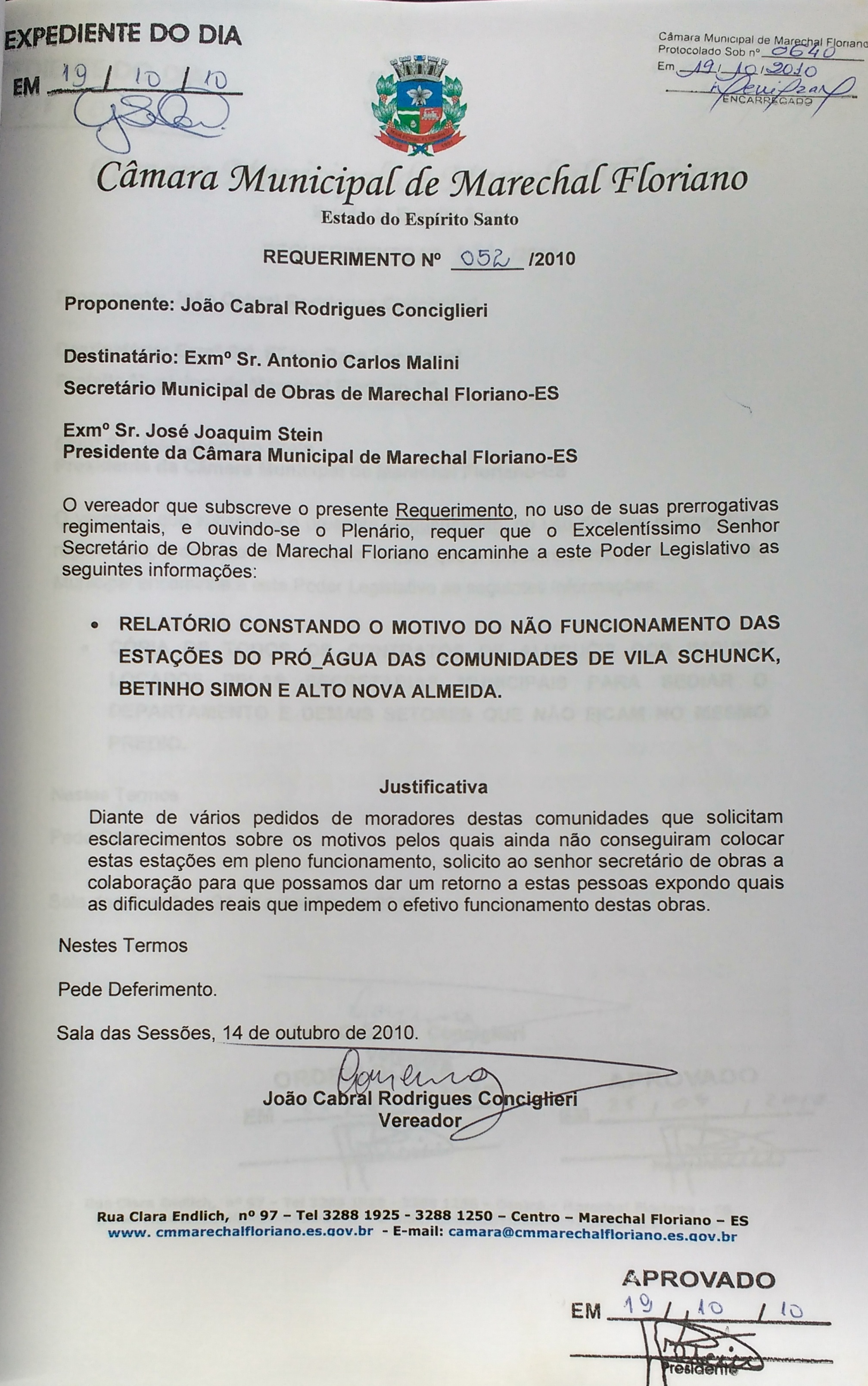 RELATÓRIO CONSTANDO O MOTIVO DO NÃO FUNCIONAMENTO DAS ESTAÇÕES DO PRÓ-ÁGUA DAS COMUNIDADES DE VILA SCHUNCK, BETINHO SIMON E ALTO NOVA ALMEIDA.