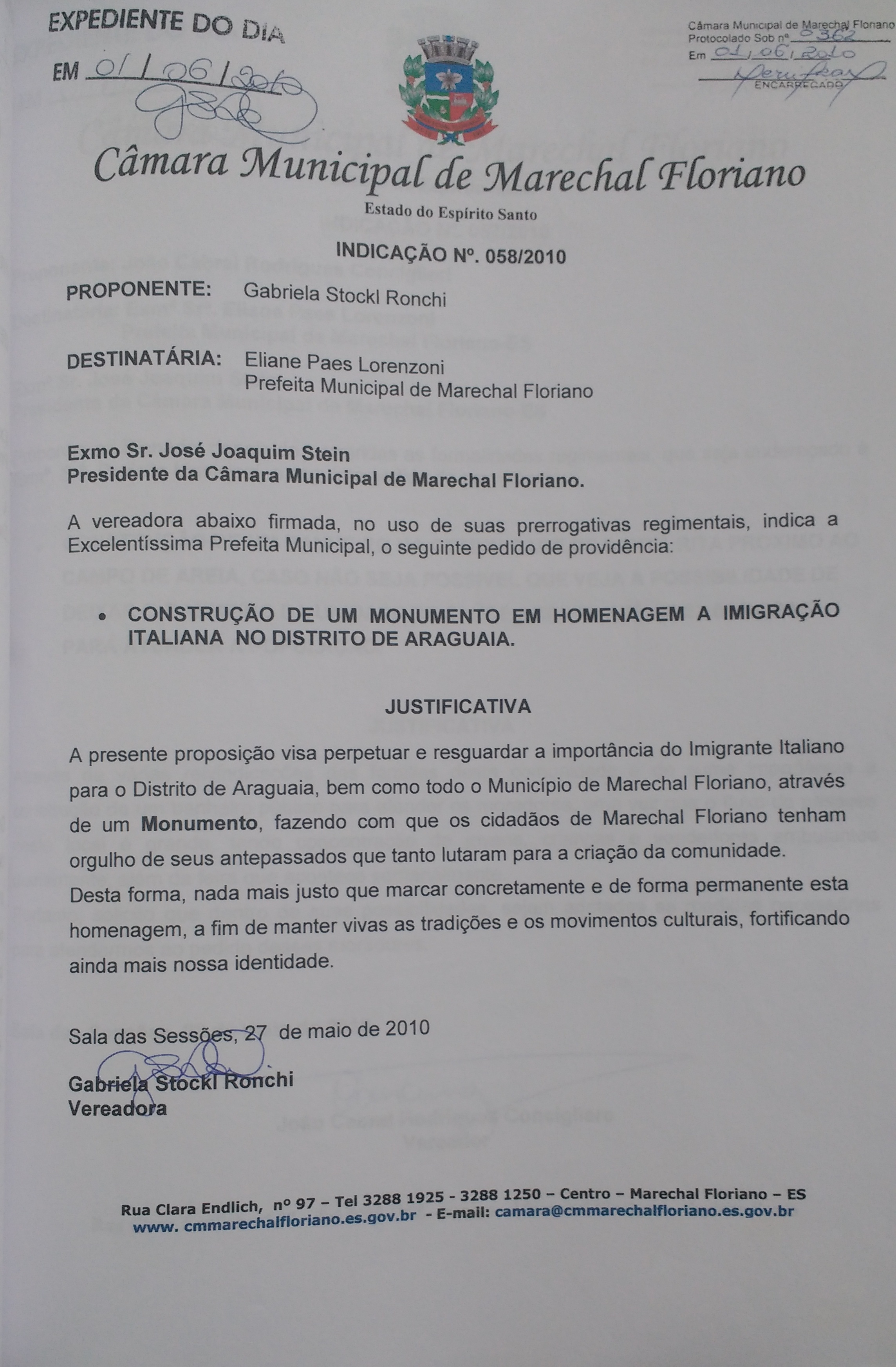 CONSTRUÇÃO DE UM MONUMENTO EM HOMENAGEM A IMIGRAÇÃO ITALIANA NO DISTRITO DE ARAGUAIA.