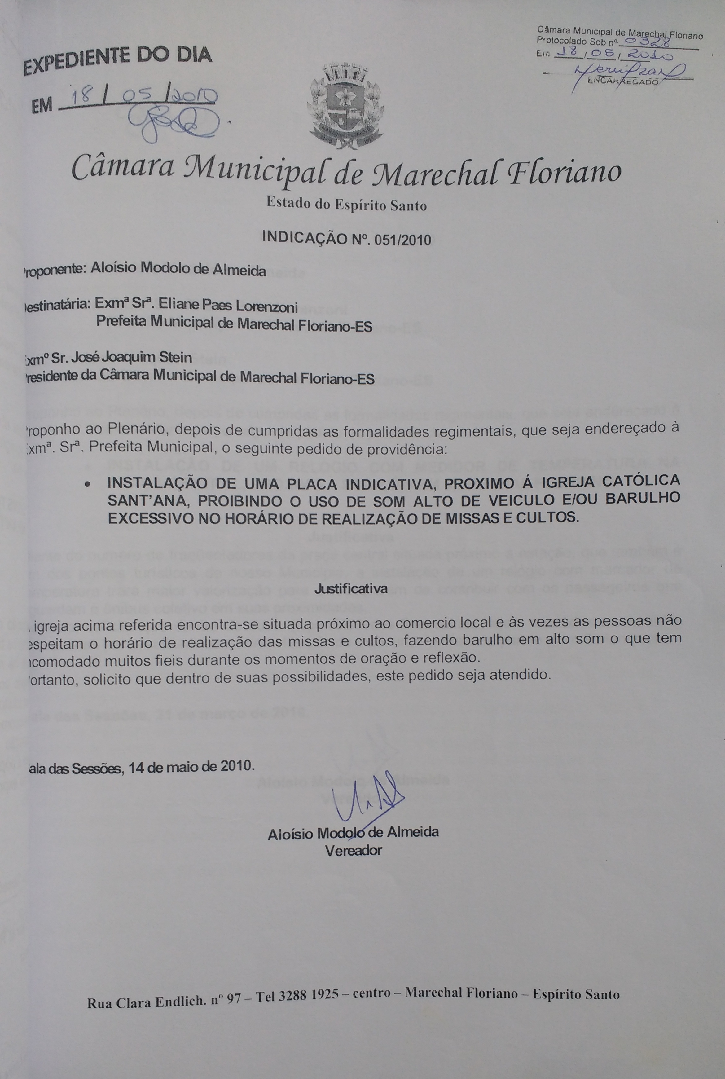 INSTALAÇÃO DE UMA PLACA INDICATIVA, PRÓXIMO Á IGREJA CATÓLICA SANT'ANA, PROIBINDO O USO DE SOM ALTO DE VEICULO E/OU BARULHO EXCESSIVO NO HORÁRIO DE REALIZAÇÃO DE MISSAS E CULTOS.