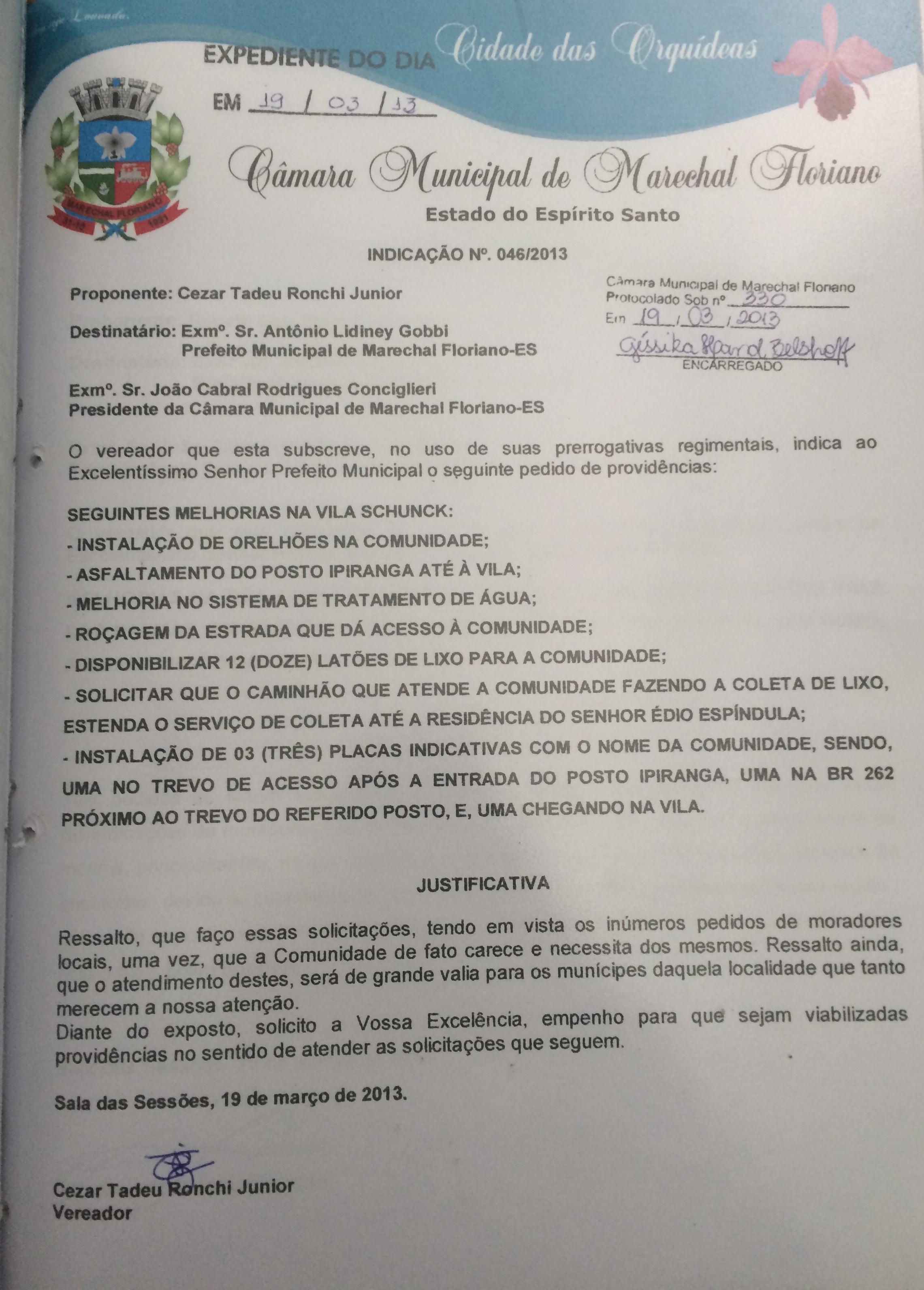 -INSTALAÇÃO DE 03 (TRÊS) PLACAS INDICATIVAS COM O NOME DA COMUNIDADE, SENDO, UMA NO TREVO DE ACESSO APÓS A ENTRADA DO POSTO IPIRANGA, UMA NA BR 262 PROXINO AO TREVO REFERIDO POSTO, E, UMA CHEGANDO NA VILA.
