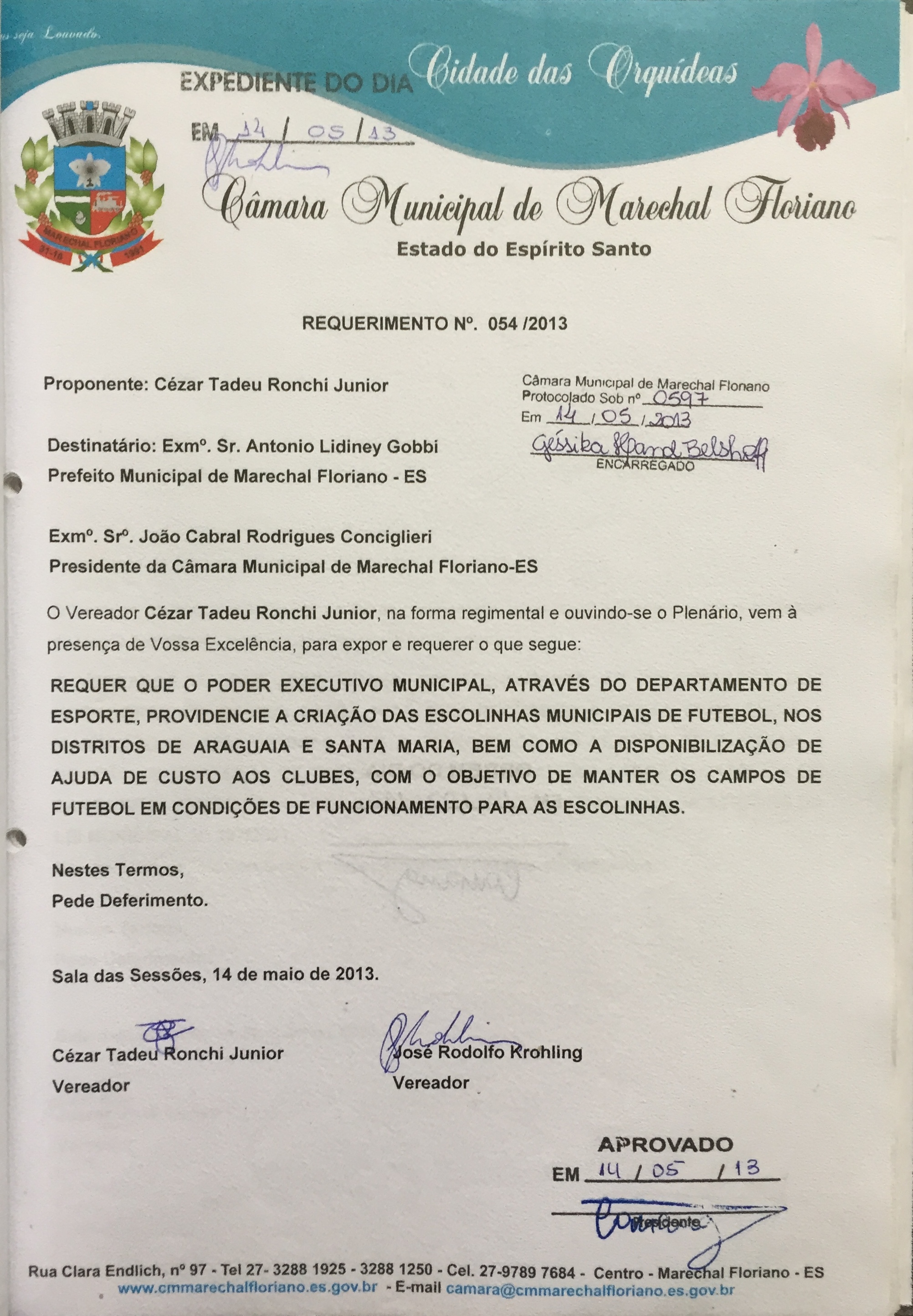 REQUER QUE O PODER EXECUTIVO MUNICIPAL, ATRAVÉS DO DEPARTAMENTO DE ESPORTE, PROVIDENCIE A CRIAÇÃO DAS ESCOLINHAS MUNICIPAIS DE FUTEBOL, NOS DISTRITOS DE ARAGUAIA E SANTA MARIA, BEM COMO A DISPONIBILIZAÇÃO DE AJUDA DE CUSTOS AOS CLUBES, COM O OBJETIVO DE MANTER OS CAMPOS DE FUTEBOL EM CONDIÇÕES DE FUNCIONAMENTO PARA AS ESCOLINHAS.