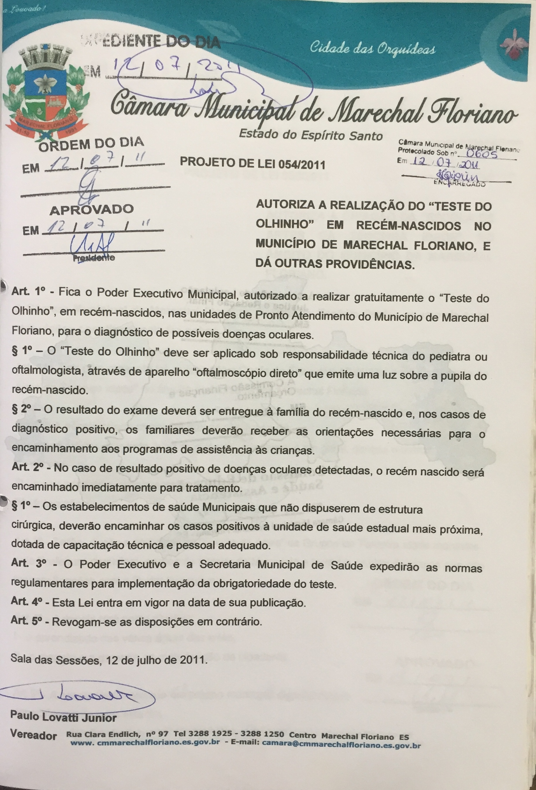 AUTORIZA A REALIZAÇÃO DO "TESTE DO OLHINHO" EM RECÉM-NASCIDOS NO MUNICÍPIO DE MARECHAL FLORIANO, E DÁ OUTRAS PROVIDÊNCIAS.