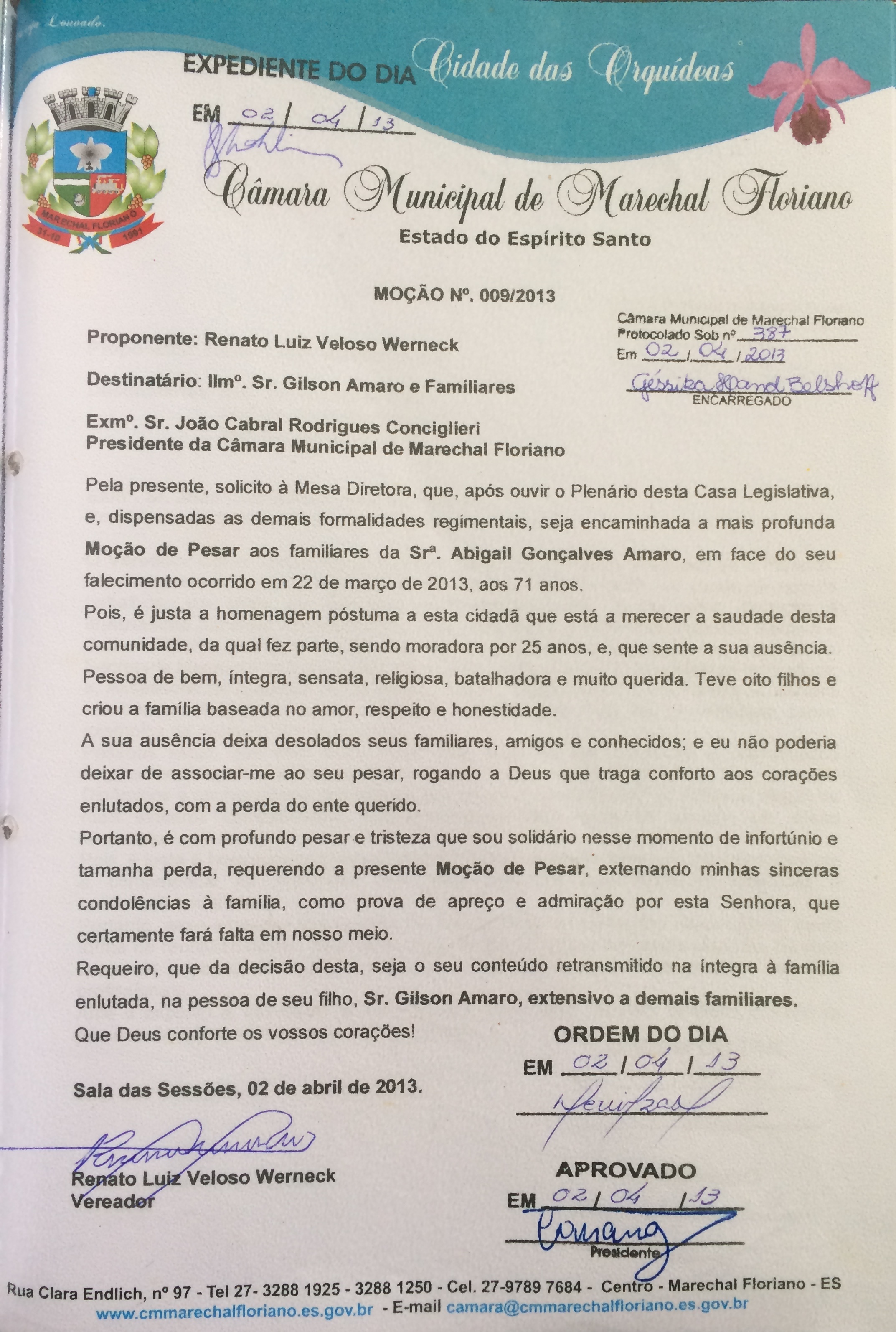 MOÇÃO DE PESAR AOS FAMILIARES DA SRª. ABIGAIL GONÇALVES AMARO, EM FACE DE SEU FALECIMENTO.