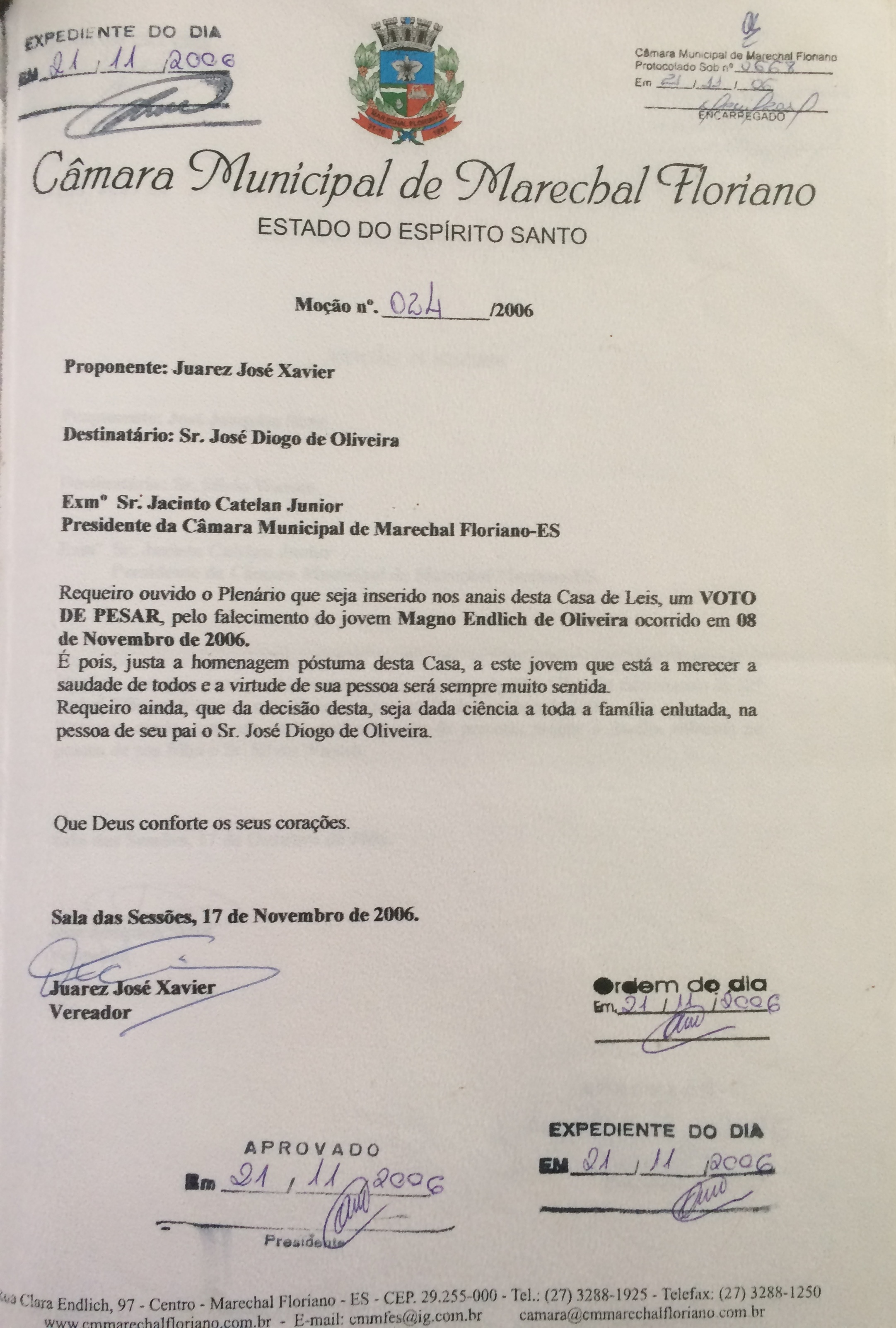 MOÇÃO DE PESAR PELO FALECIMENTO DO JOVEM MAGNO ENDLICH DE OLIVEIRA OCORRIDO EM 08 DE NOVEMBRO DE 2006.