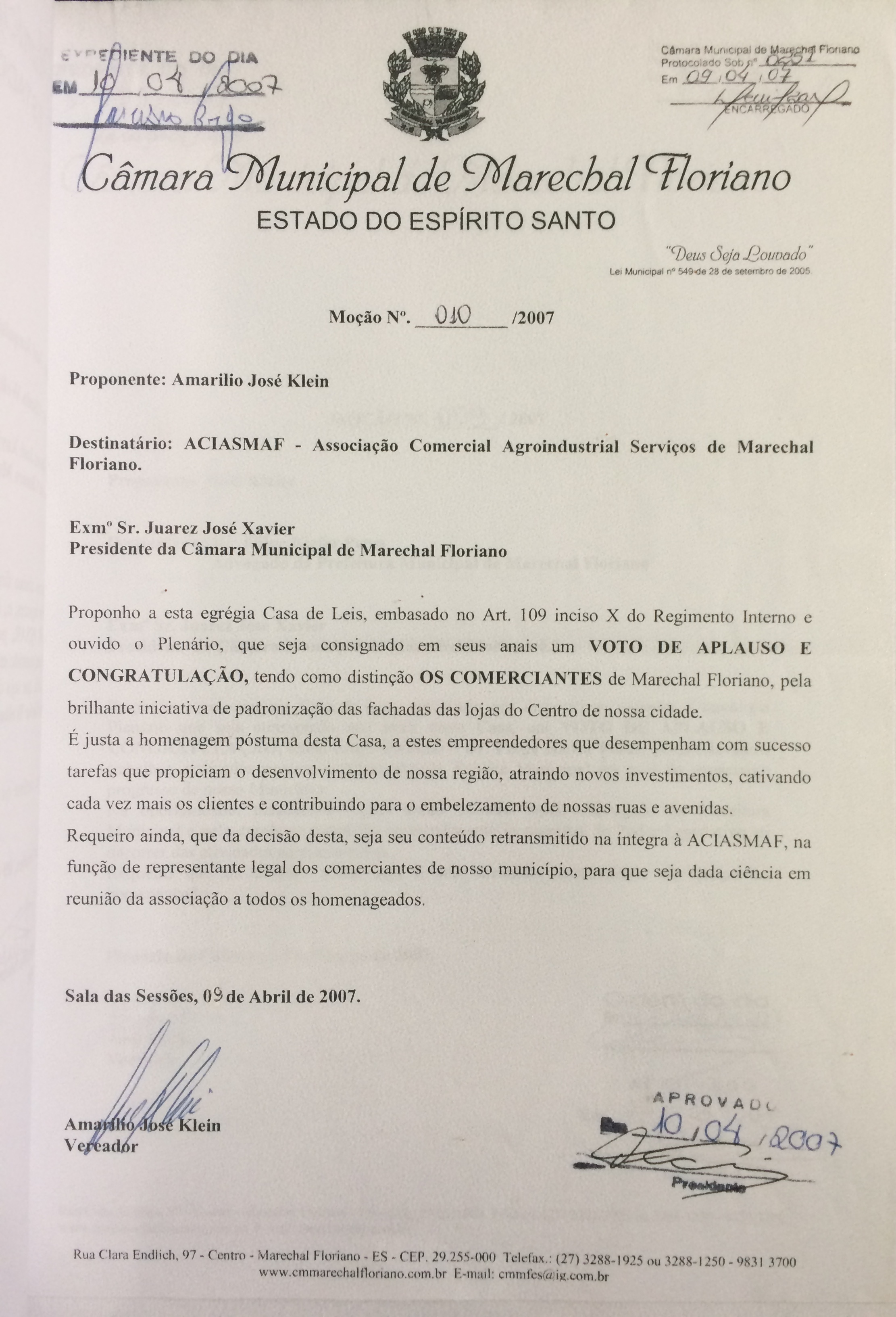 MOÇÃO DE APLAUSO E CONGRATULAÇÃO, TENDO COMO DISTINÇÃO OS COMERCIANTES DE MARECHAL FLORIANO.