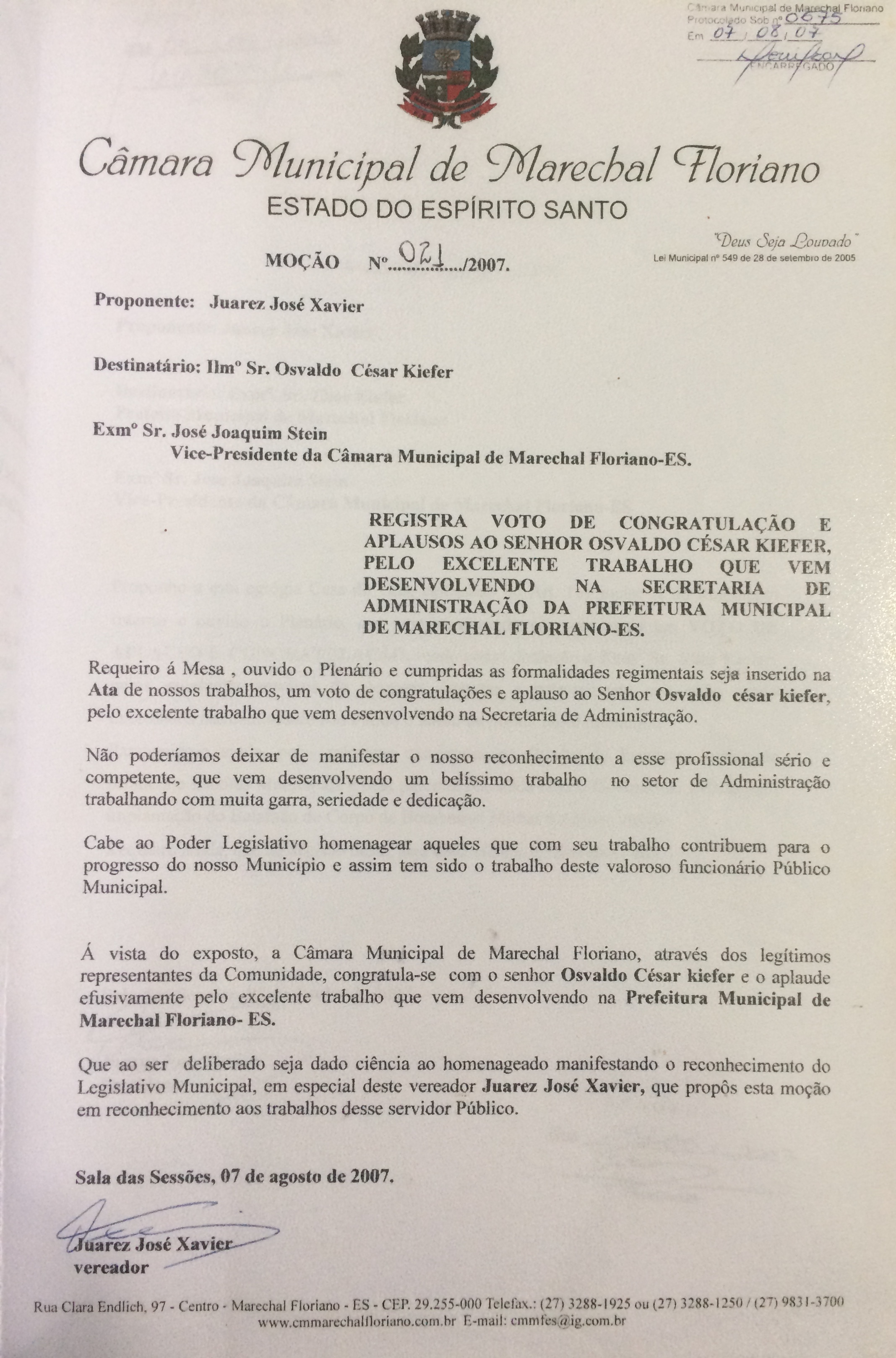 MOÇÃO DE APLAUSO E CONGRATULAÇÃO AO SENHOR OSVALDO CÉSAR KIEFER, PELO EXCELENTE TRABALHO QUE VEM DESENVOLVENDO NA SECRETARIA DE ADMINISTRAÇÃO DA PREFEITURA MUNICIPAL DE MARECHAL FLORIANO-ES.