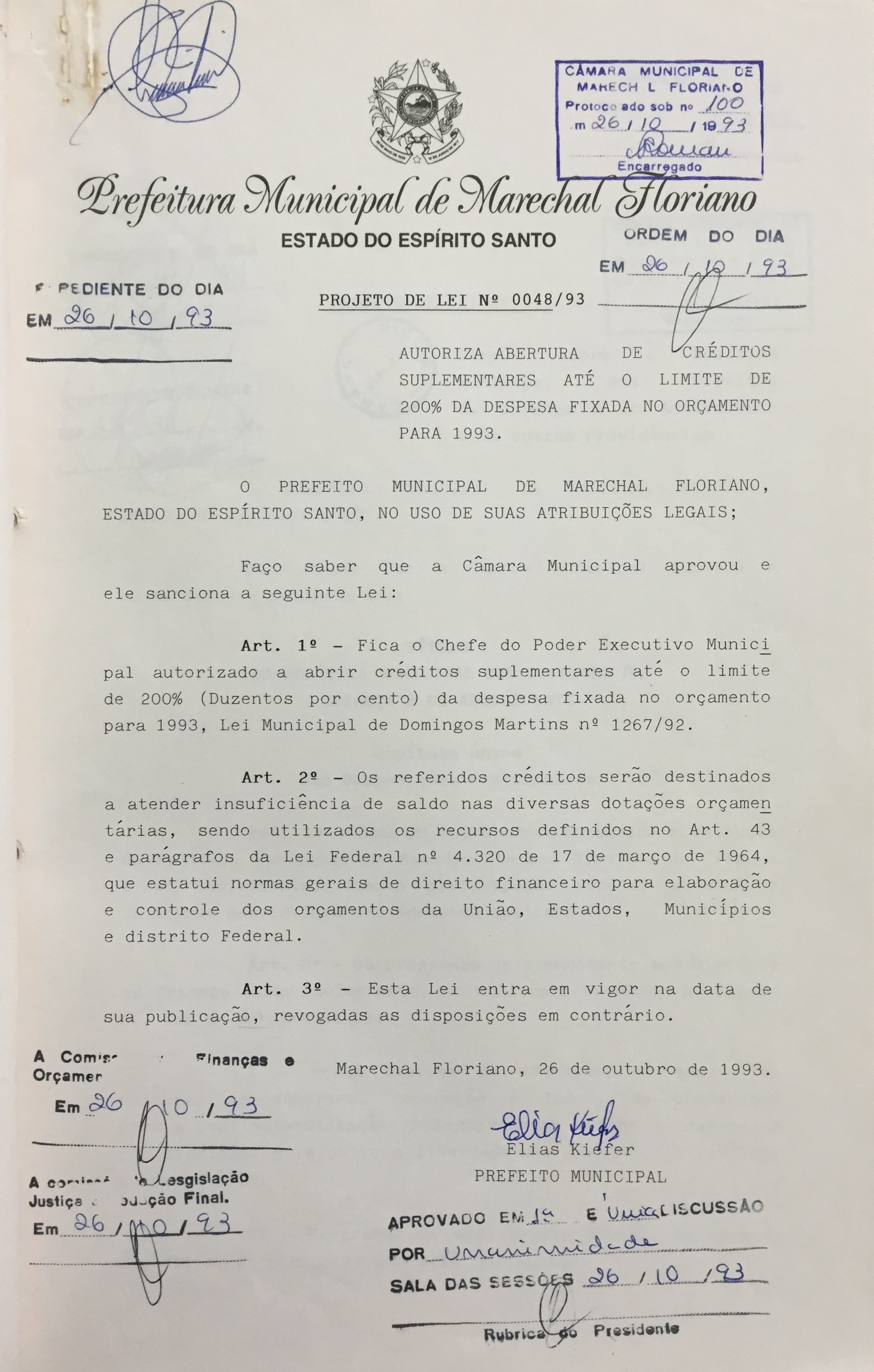 A CÂMARA MUNICIPAL DE MARECHAL FLORIANO, ESTADO DO ESPÍRITO SANTO, NO USO DE SUAS ATRIBUIÇÕES CONSTITUCIONAIS E TOMANDO CONHECIMENTO DO PROJETO DE LEI N°. 048/1993 DE AUTORIA DO PODER EXECUTIVO MUNICIPAL.