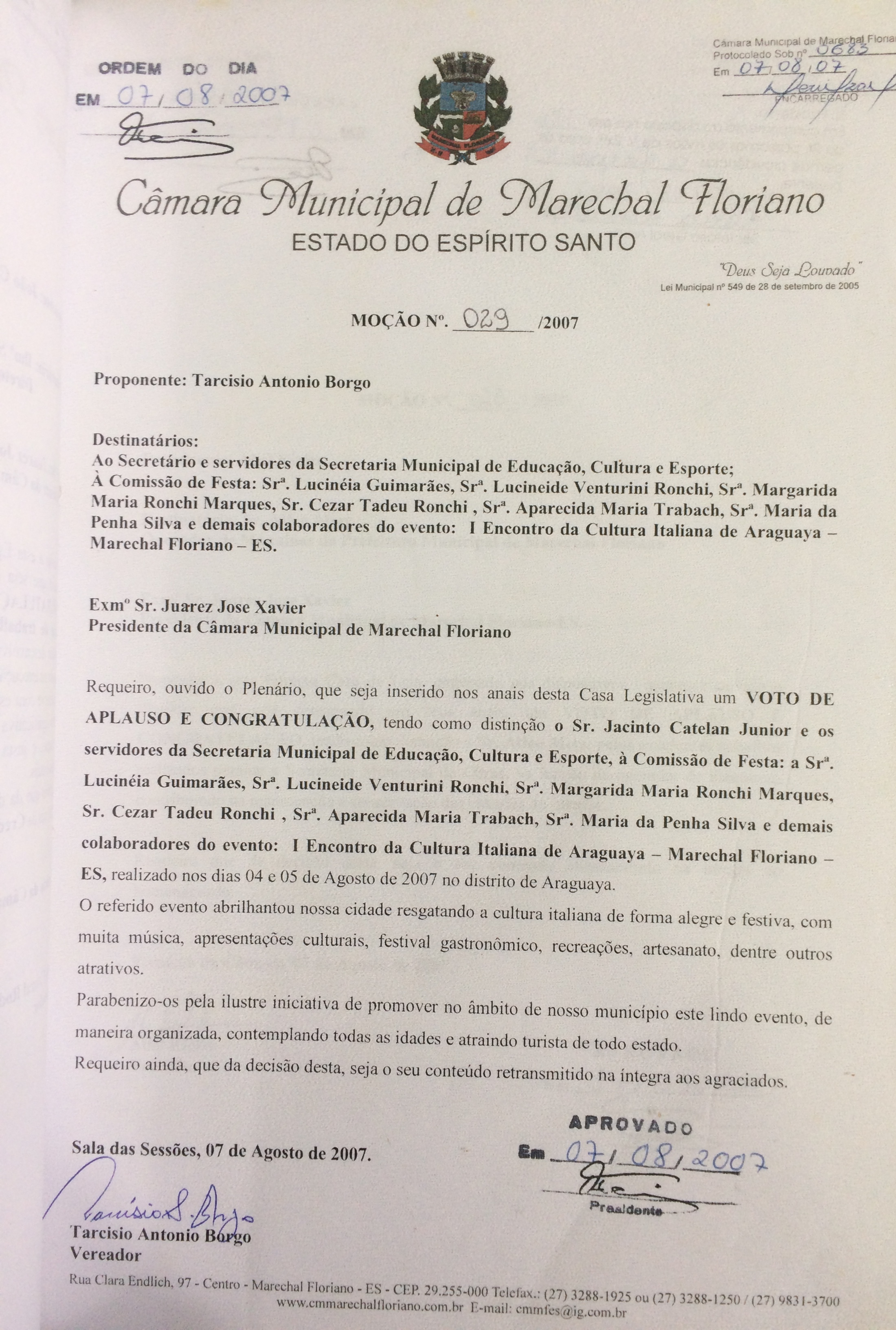 MOÇÃO DE APLAUSO E CONGRATULAÇÃO, TENDO COMO DISTINÇÃO O SR. JACINTO CATELAN JUNIOR E OS SERVIDORES DA SECRETARIA MUNICIPAL DE EDUCAÇÃO, CULTURA E ESPORTES, À COMISSÃO DE FESTA: A SRª. LUCINÉIA GUIMARÃES, SRª. LUCINEIDE VENTURINI RONCHI, SRª. MARGARIDA MARIA RONCHI MARQUES, SR. CEZAR TADEU RONCHI, SRª. APARECIDA MARIA TRABACH, SRª. MARIA DA PENHA SILVA E DEMAIS COLABORADORES DO EVENTO: I ENCONTRO DA CULTURA ITALIANA DE ARAGUAYA - MARECHAL FLORIANO - ES.