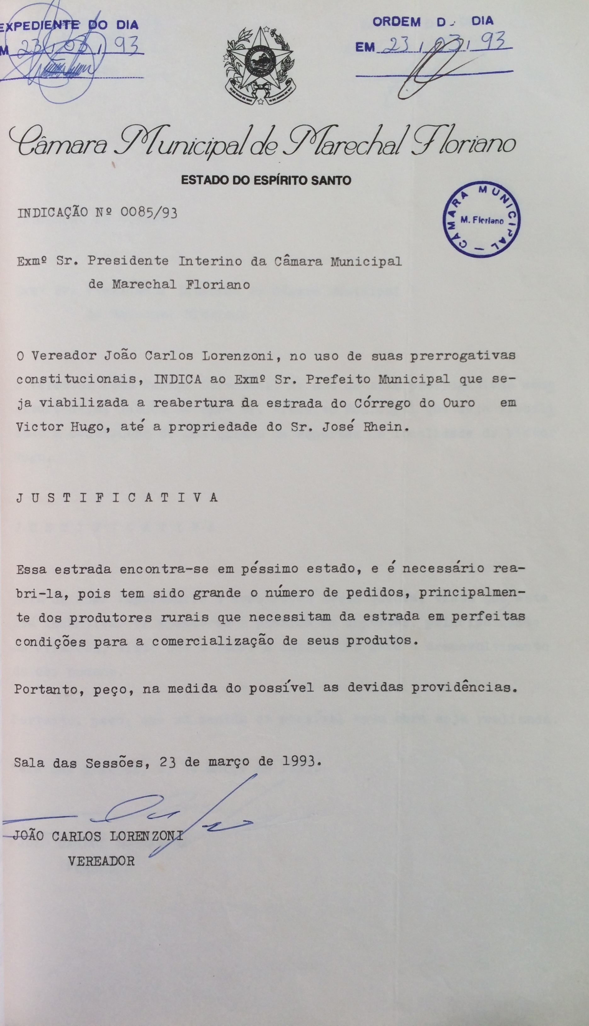 INDICA QUE SEJA VIABILIZADA A REABERTURA DA ESTRADA DO CÓRREGO DO OURO EM VICTOR HUGO, ATÉ A PROPRIEDADE DO SR. JOSÉ RHEIN.