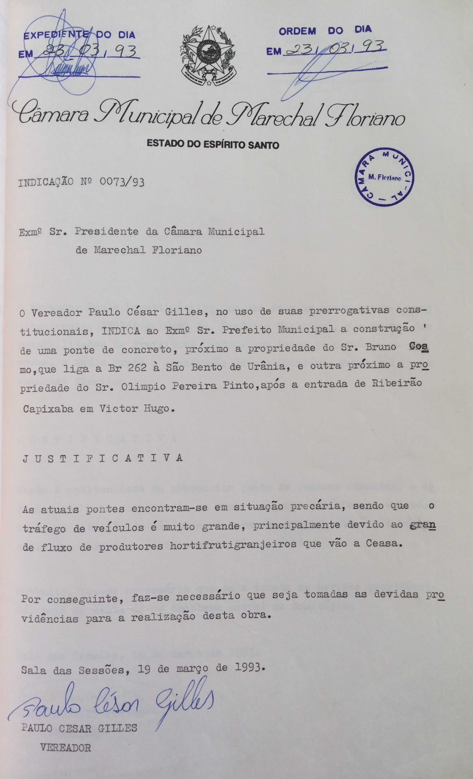 INDICA A CONSTRUÇÃO DE UMA PONTE DE CONCRETO PRÓXIMO A PROPRIEDADE DO SR. BRUNO COSMO, QUE LIGA A BR 262 À SÃO BENTO URÂNIA, E OUTRA PRÓXIMO A PROPRIEDADE DO SR. OLIMPIO PEREIRA PINTO, APÓS A ENTRADA DE RIBEIRÃO CAPIXABA EM VICTOR HUGO.