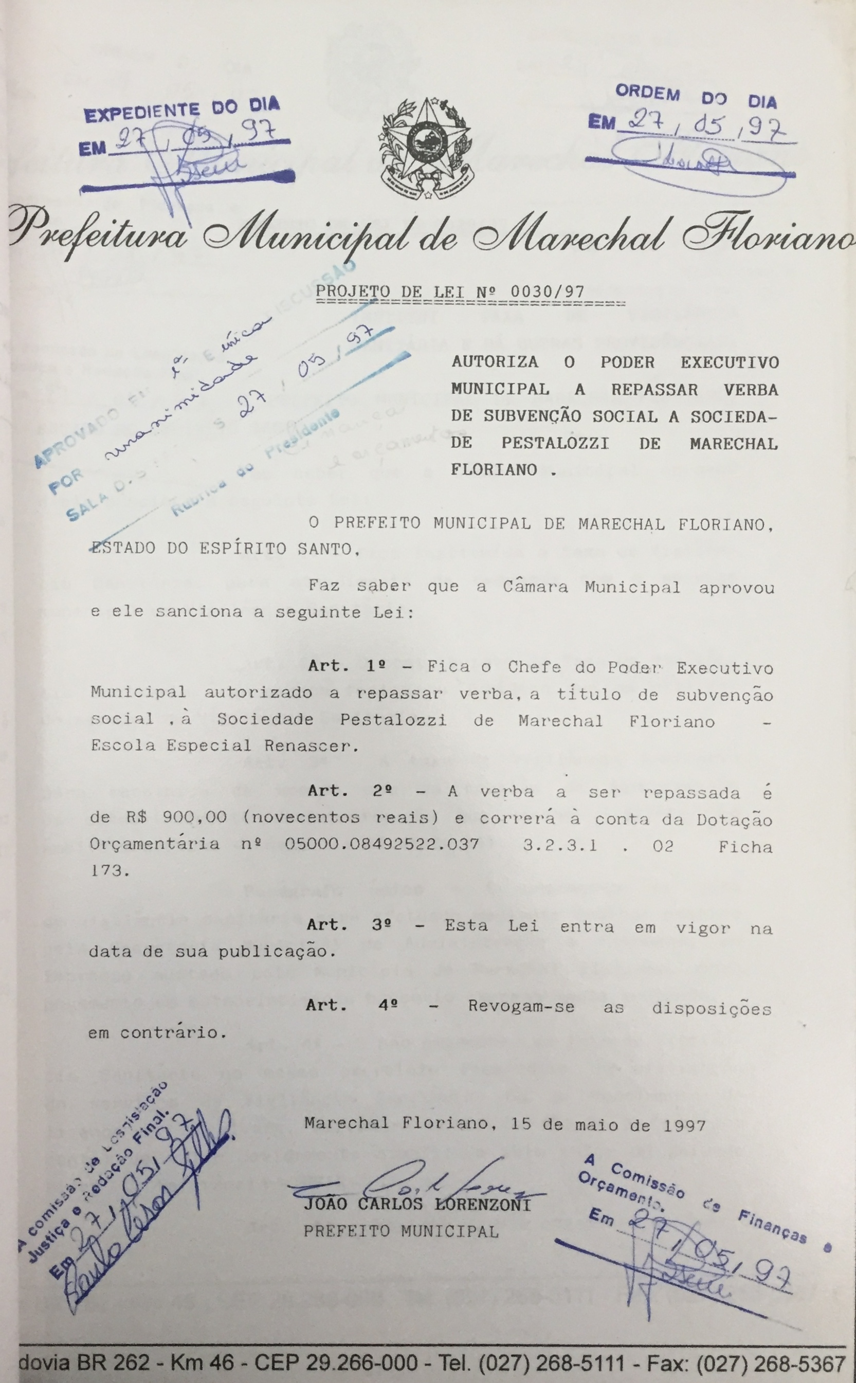 A CÂMARA MUNICIPAL DE MARECHAL FLORIANO, ESTADO DO ESPÍRITO SANTO, NO USO DE SUAS ATRIBUIÇÕES CONSTITUCIONAIS E TOMANDO CONHECIMENTO DO PROJETO DE LEI N°. 030/1997 DE AUTORIA DO PODER EXECUTIVO MUNICIPAL.