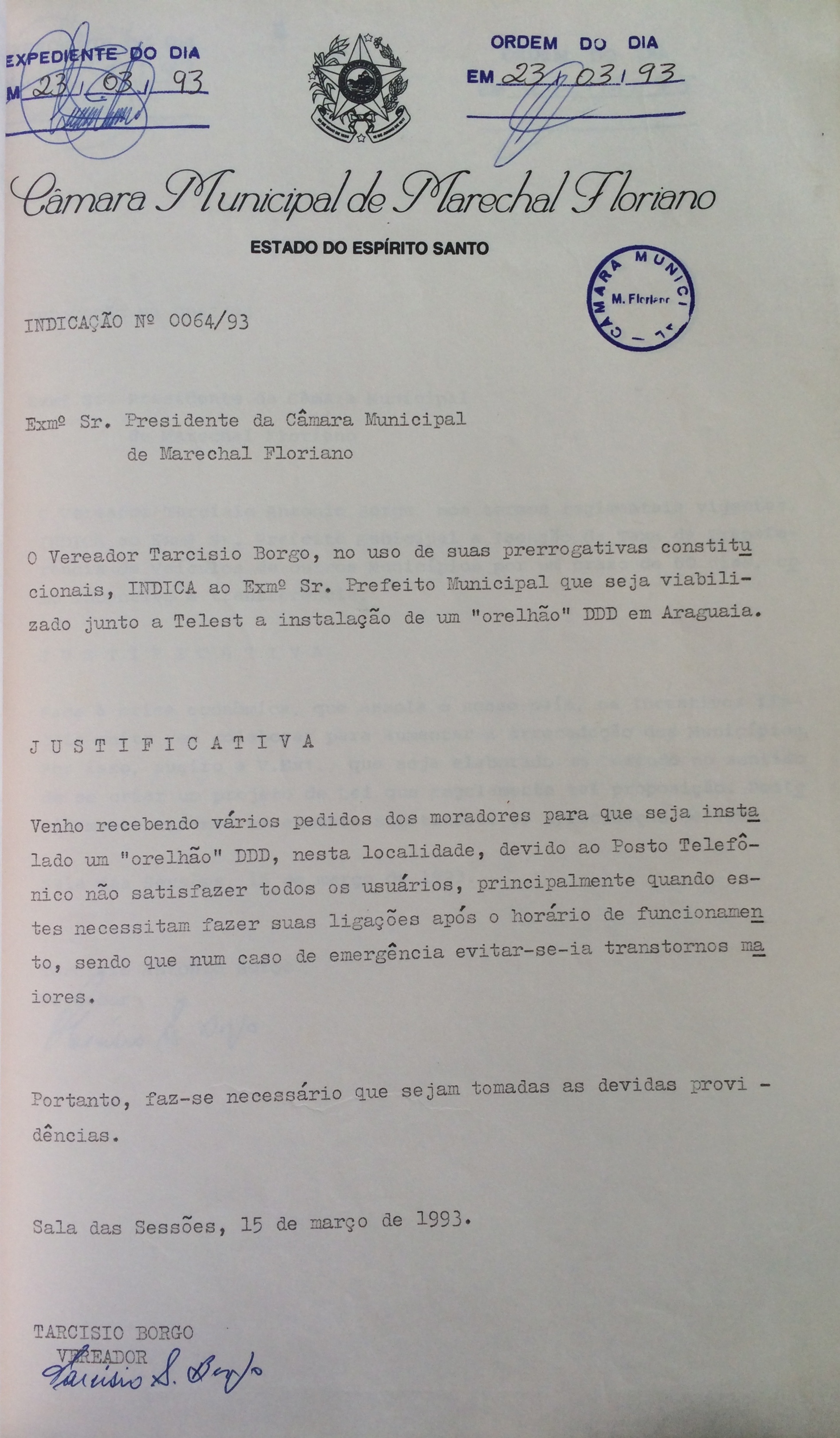 INDICA QUE SEJA VIABILIZADO JUNTO A TELEST A INSTALAÇÃO DE UM "ORELHÃO" DDD EM ARAGUAIA.