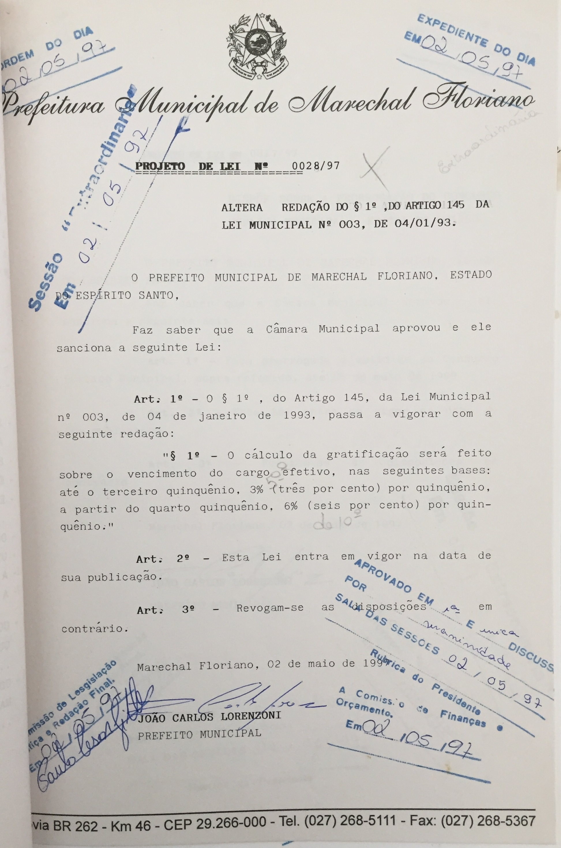 A CÂMARA MUNICIPAL DE MARECHAL FLORIANO, ESTADO DO ESPÍRITO SANTO, NO USO DE SUAS ATRIBUIÇÕES CONSTITUCIONAIS E TOMANDO CONHECIMENTO DO PROJETO DE LEI N°. 028/1997 DE AUTORIA DO PODER EXECUTIVO MUNICIPAL.