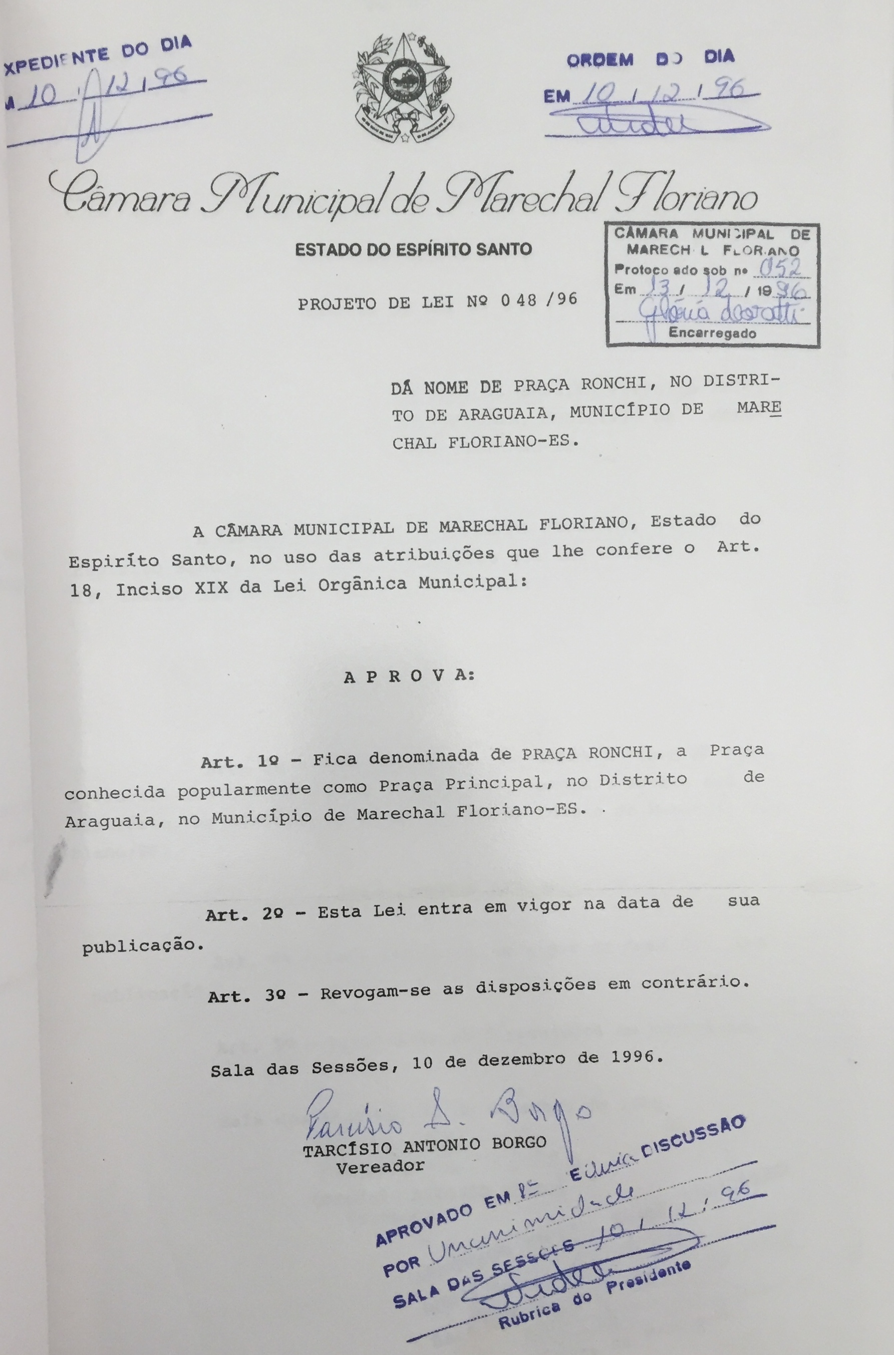 A CÂMARA MUNICIPAL DE MARECHAL FLORIANO, ESTADO DO ESPÍRITO SANTO, NO USO DE SUAS ATRIBUIÇÕES CONSTITUCIONAIS E TOMANDO CONHECIMENTO DO PROJETO DE LEI N°. 048/1996 DE AUTORIA DO VEREADOR TARCISIO ANTONIO BORGO.