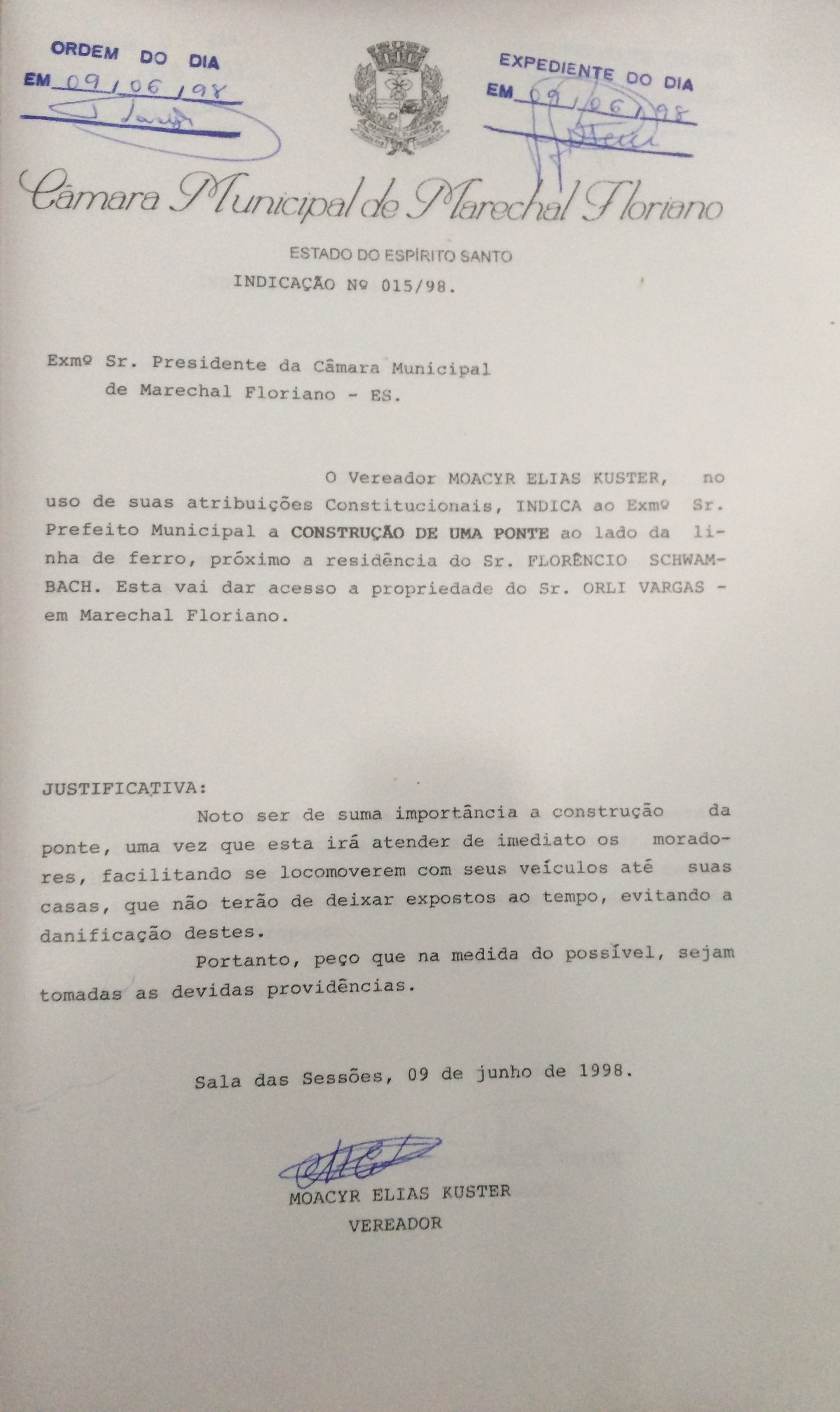 CONSTRUÇÃO DE UMA PONTE AO LADO DA LINHA DE FERRO, PRÓXIMO A RESIDÊNCIA DO SR. FLORÊNCIO SCHWAMBACH. ESTA VAI DAR ACESSO A PROPRIEDADE DO SR. ORLI VARGAS EM MARECHAL FLORIANO.