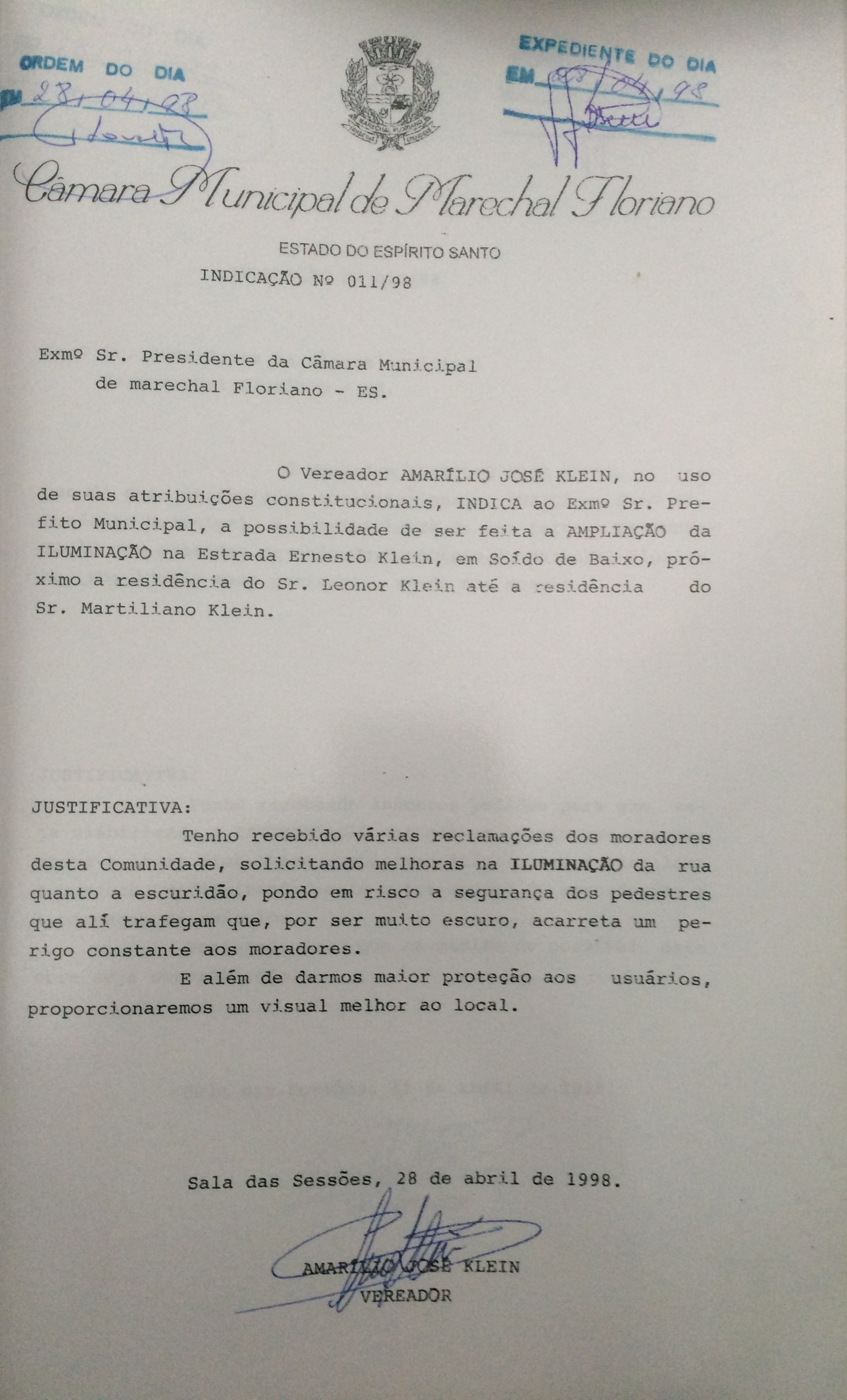 INDICA A POSSIBILIDADE DE SER FEITA A AMPLIAÇÃO DA ILUMINAÇÃO NA ESTRADA ERNESTO KLEIN, EM SOÍDO DE BAIXO, PRÓXIMO A RESIDÊNCIA DO SR. LEONOR KLEIN ATÉ A RESIDÊNCIA DO SR. MARTILIANO KLEIN.