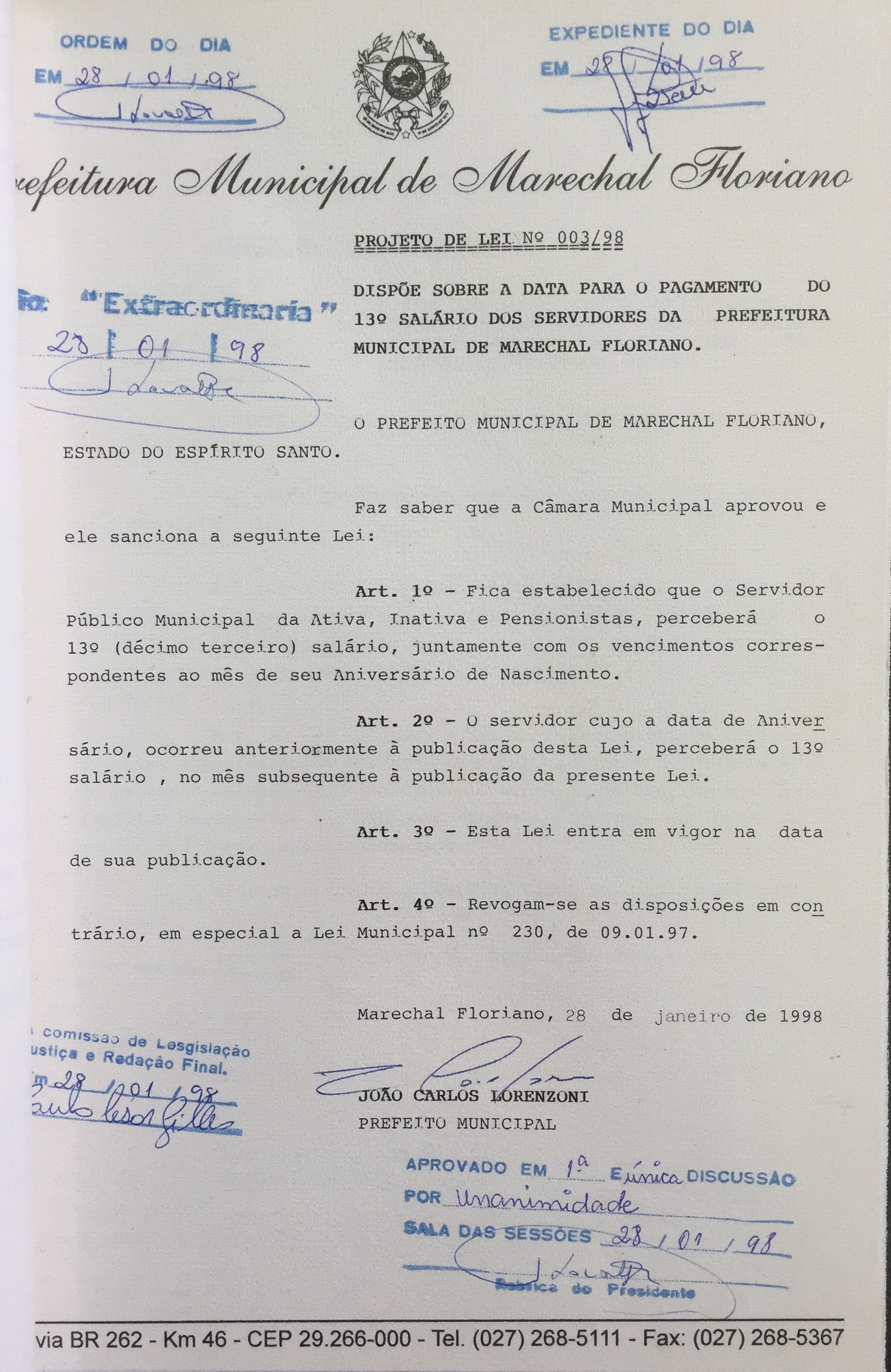 DISPÕE SOBRE A DATA PARA O PAGAMENTO DO 13º SALÁRIO DOS SERVIDORES DA PREFEITURA MUNICIPAL DE MARECHAL FLORIANO.