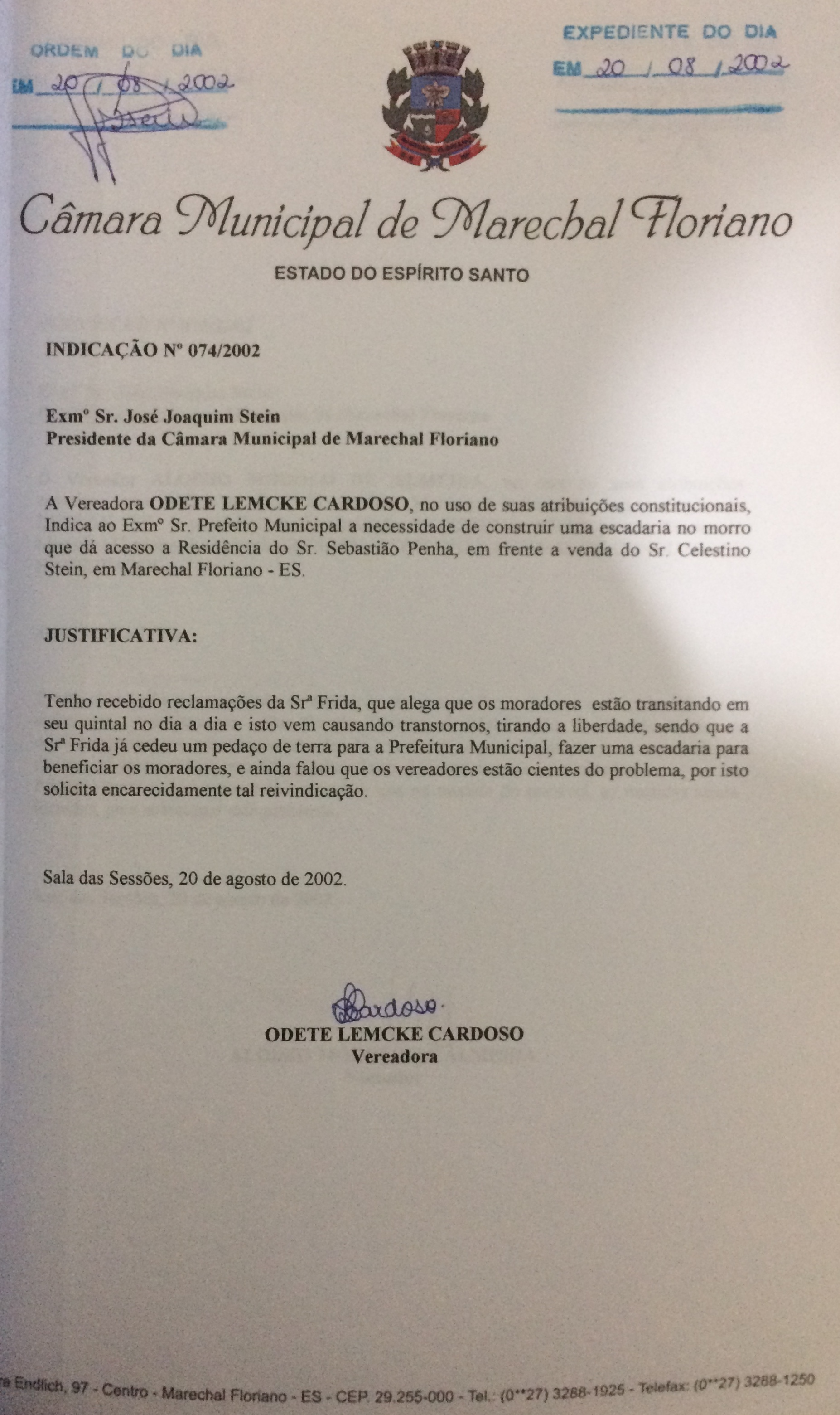 INDICA A NECESSIDADE DE CONSTRUIR UMA ESCADARIA NO MORRO QUE DÁ ACESSO A RESIDÊNCIA DO SR. SEBASTIÃO PENHA, EM FRENTE A VENDA DO SR. CELESTINO STEIN, EM MARECHAL FLORIANO-ES.