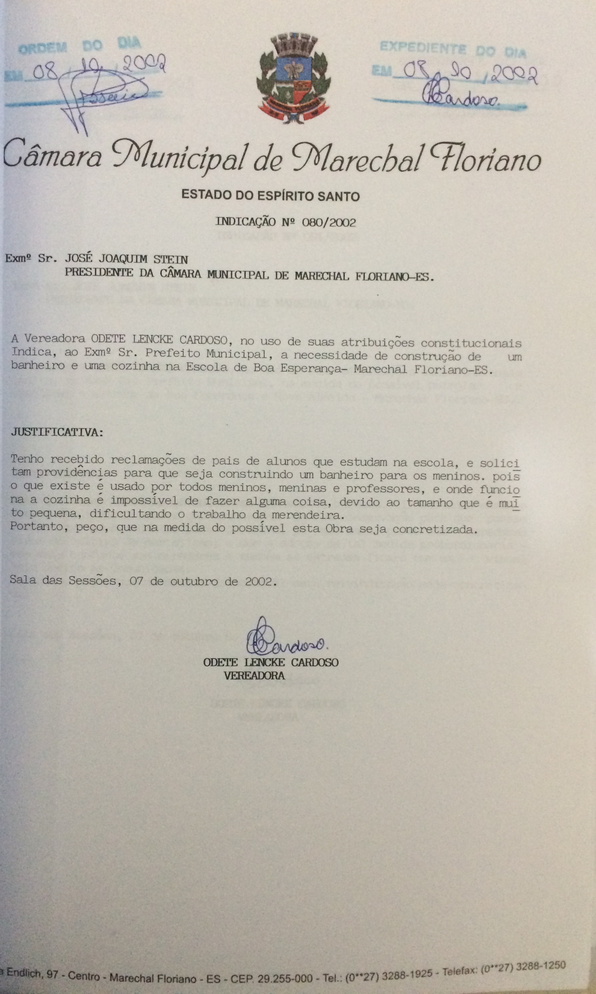 INDICA A NECESSIDADE DE CONSTRUÇÃO DE UM BANHEIRO E UMA COZINHA NA ESCOLA DE BOA ESPERANÇA - MARECHAL FLORIANO-ES.