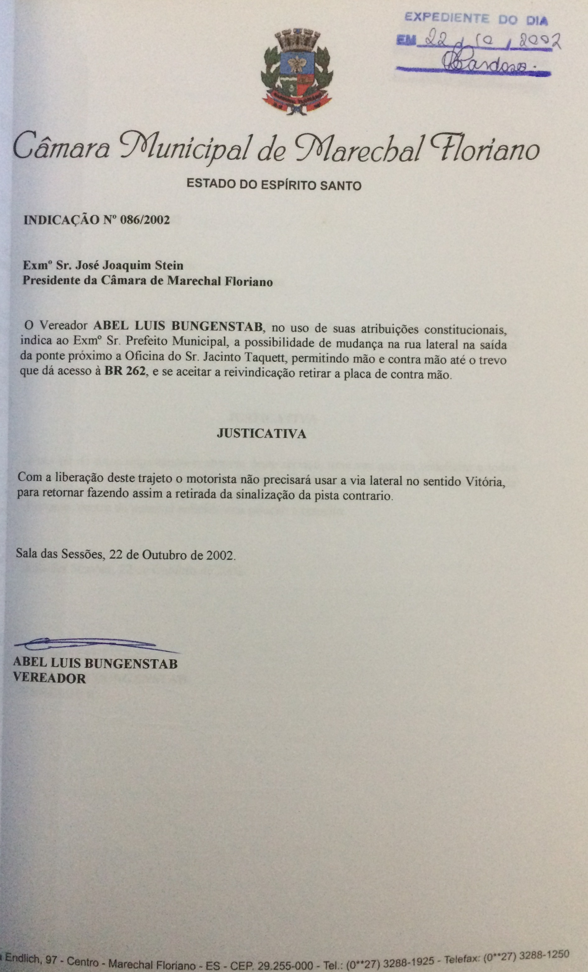 INDICA A POSSIBILIDADE DE MUDANÇA NA RUA LATERAL NA SAÍDA DA PONTE PRÓXIMO A OFICINA DO SR. JACINTO TAQUETT, PERMITINDO A MÃO E CONTRA MÃO ATÉ O TREVO QUE DÁ ACESSO A BR 262 E SE ACEITAR A REIVINDICAÇÃO RETIRAR A PLACA DE CONTRA MÃO.
