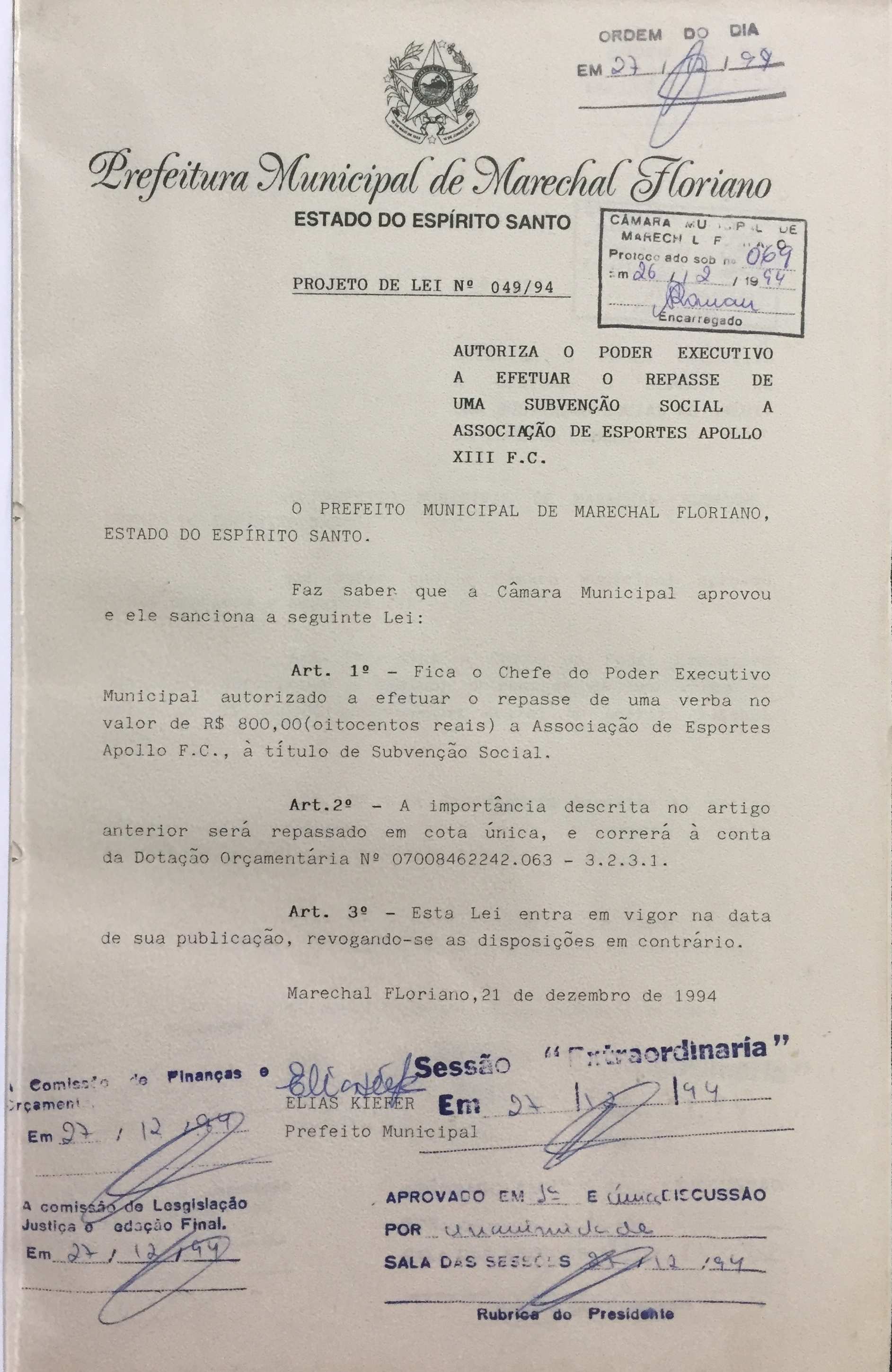 Ementa: AUTORIZA O PODER EXECUTIVO A EFETUAR O REPASSE DE UMA SUBVENÇÃO SOCIAL A ASSOCIAÇÃO DE ESPORTES APOLLO XIII F.C.