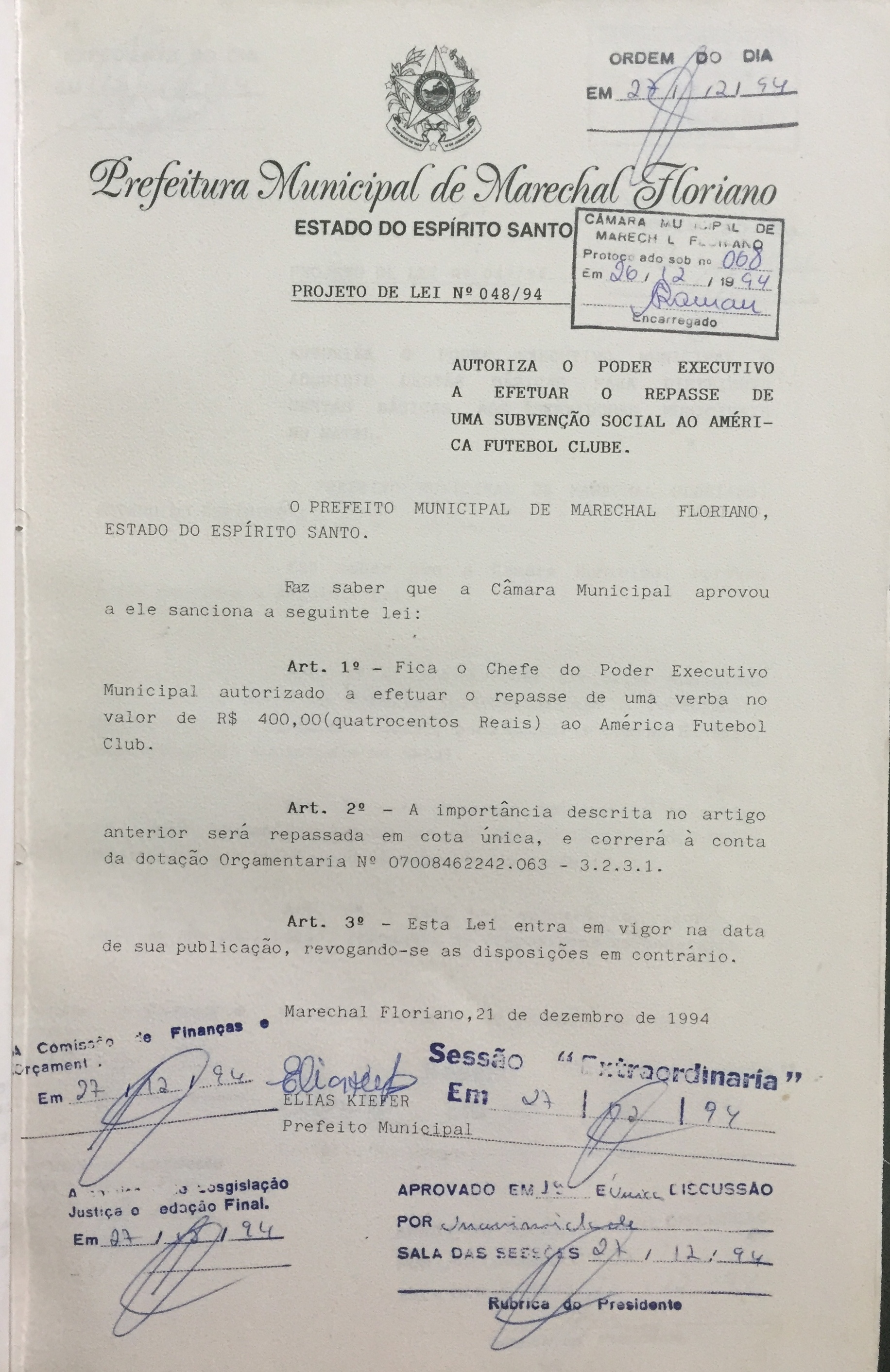 Ementa: AUTORIZA O PODER EXECUTIVO A EFETUAR O REPASSE DE UMA SUBVENÇÃO SOCIAL AO AMÉRICA FUTEBOL CLUBE.