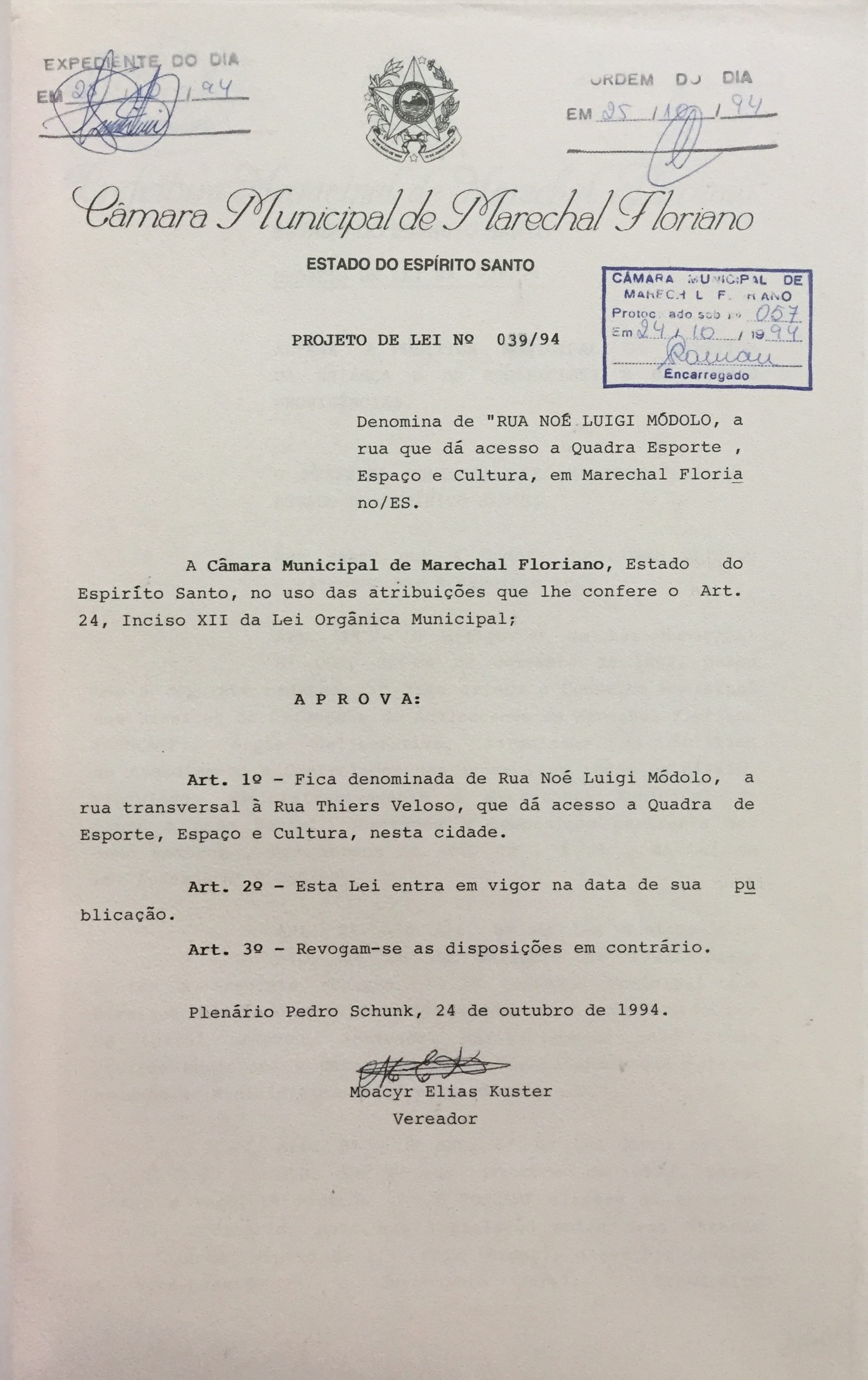 Ementa: DENOMINA DE "RUA NOÉ LUIGI MÓDOLO , A RUA QUE DÁ ACESSO A QUADRA ESPORTE, ESPAÇO E CULTURA , EM MARECHAL FLORIANO/ES .