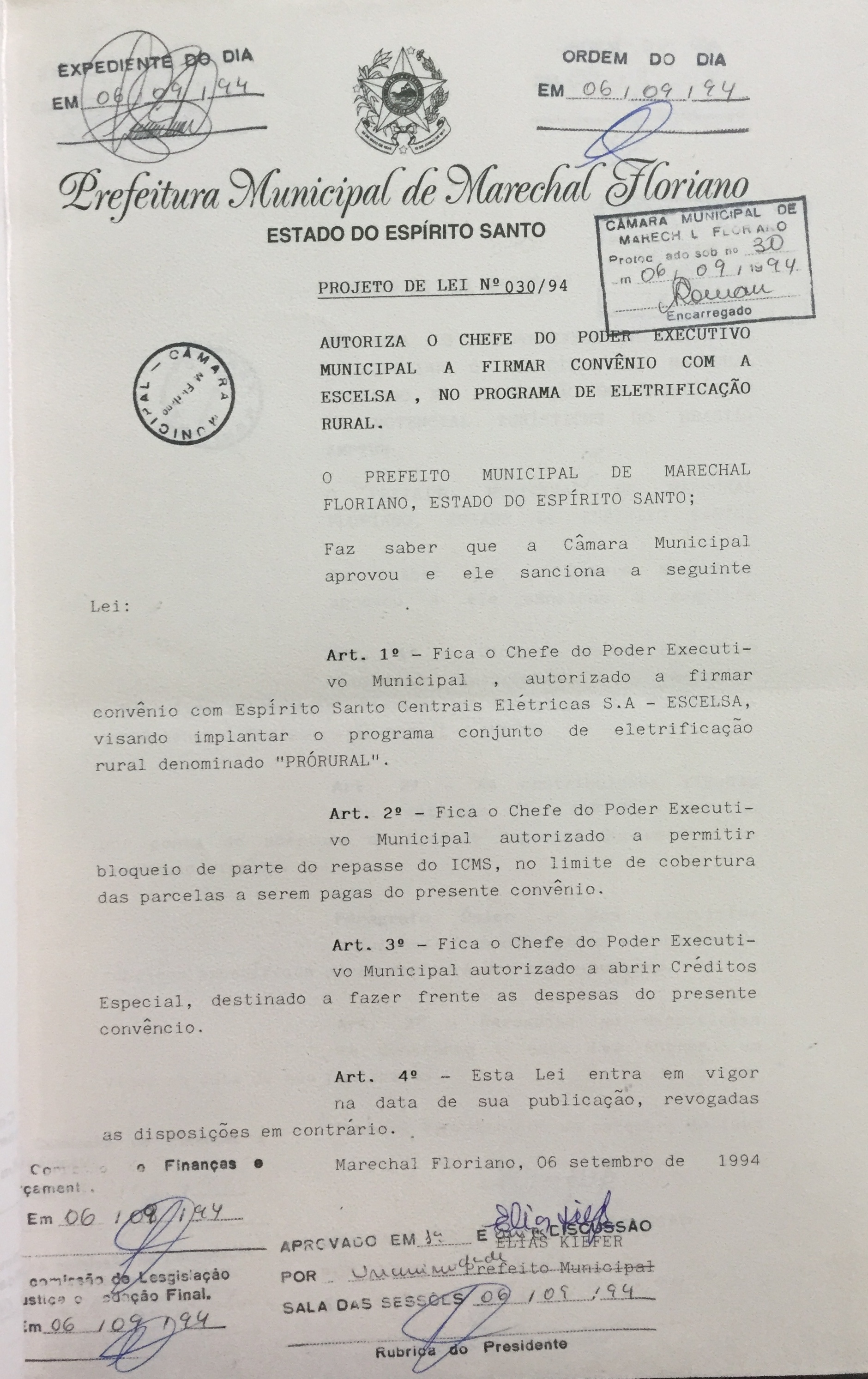 Ementa: AUTORIZA O CHEFE DO PODER EXECUTIVO MUNICIPAL A FIRMAR CONVÊNIO COM A ESCELSA , NO PROGRAMA DE ELETRIFICAÇÃO RURAL.