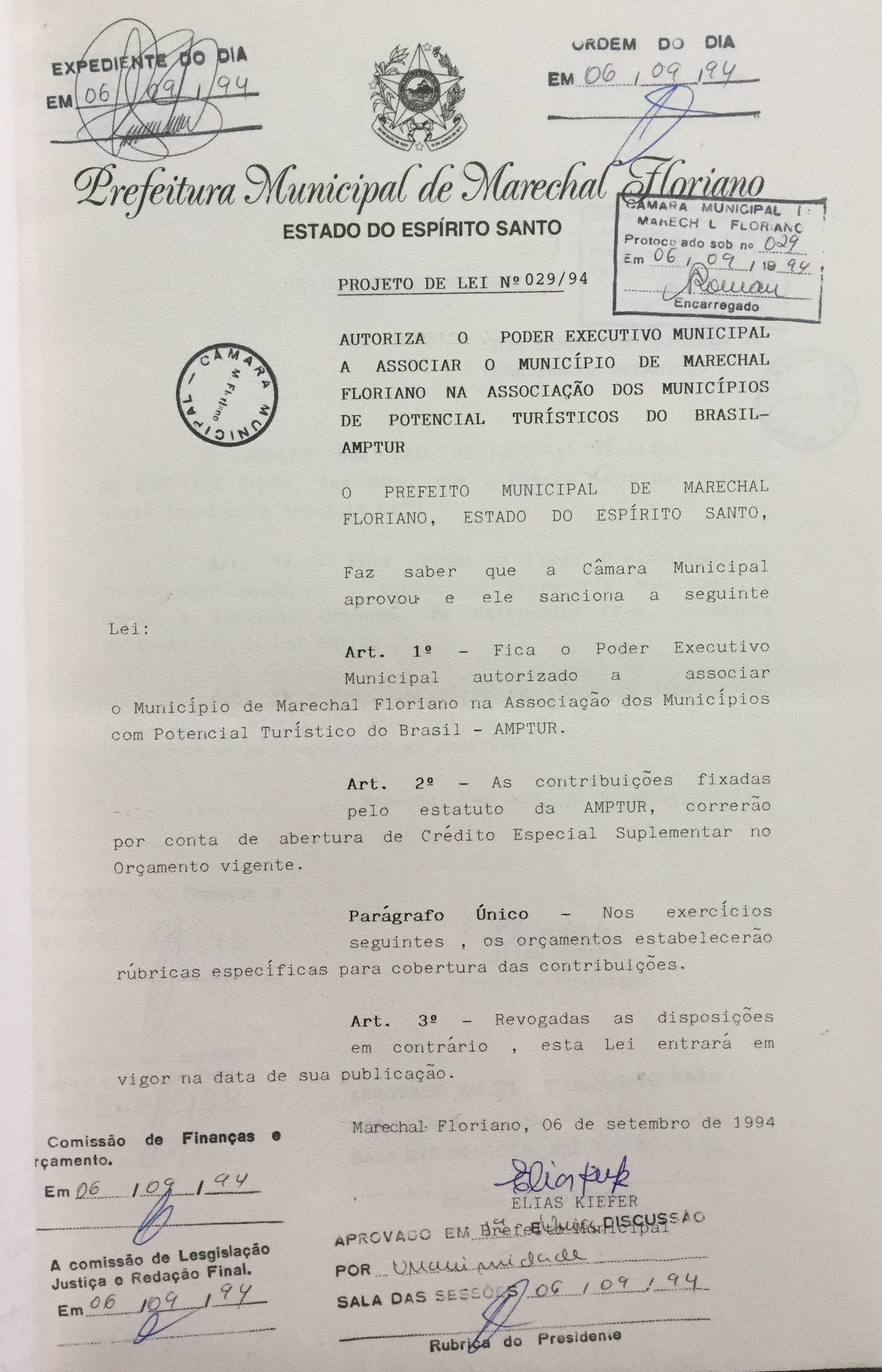 Ementa: AUTORIZA O PODER EXECUTIVO MUNICIPAL A ASSOCIAR O MUNICÍPIO DE MARECHAL FLORIANO NA ASSOCIAÇÃO DOS MUNICÍPIOS DE POTENCIAL TURÍSTICO DO BRASIL- AMPTUR .