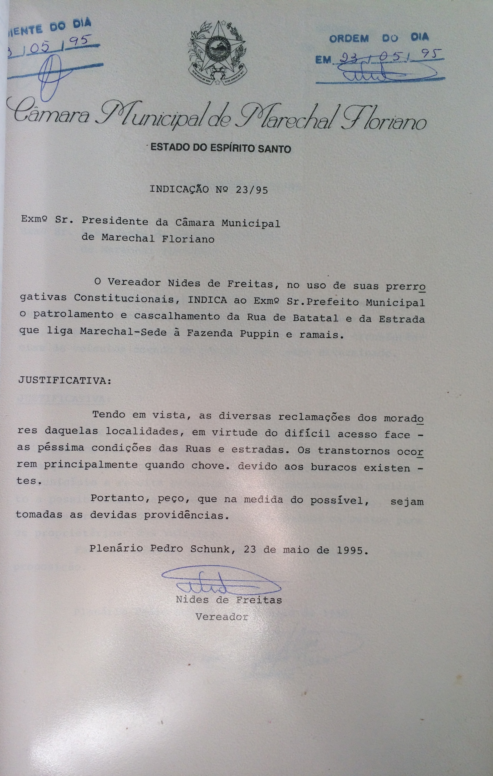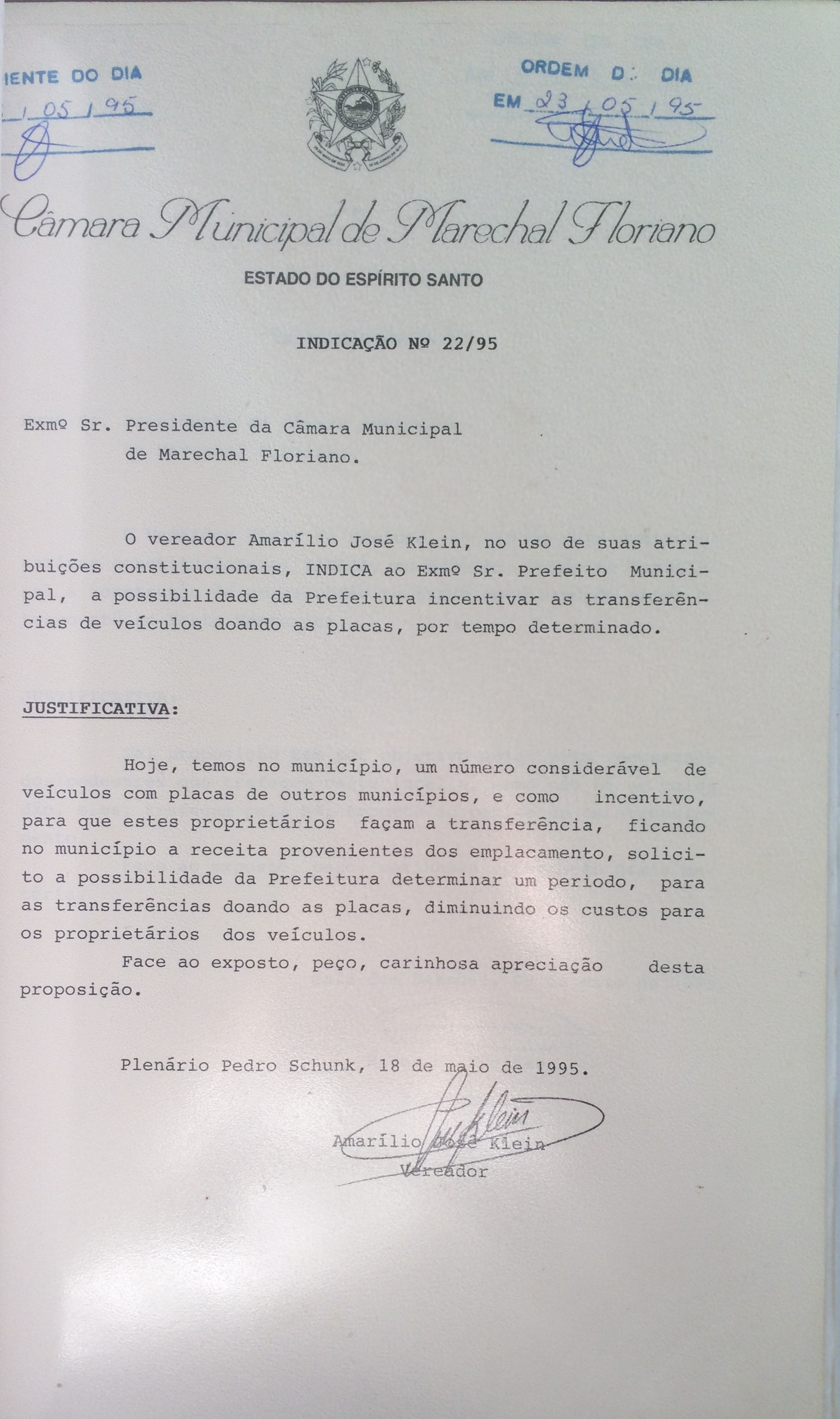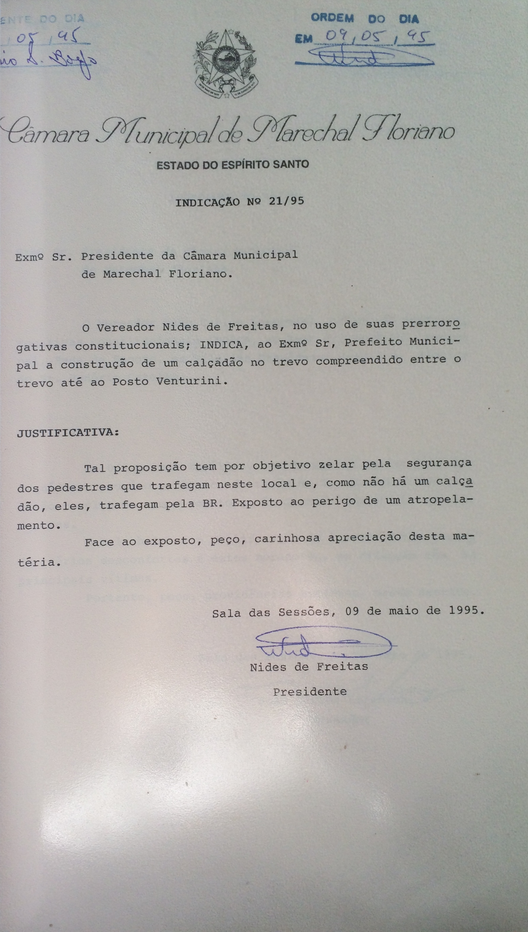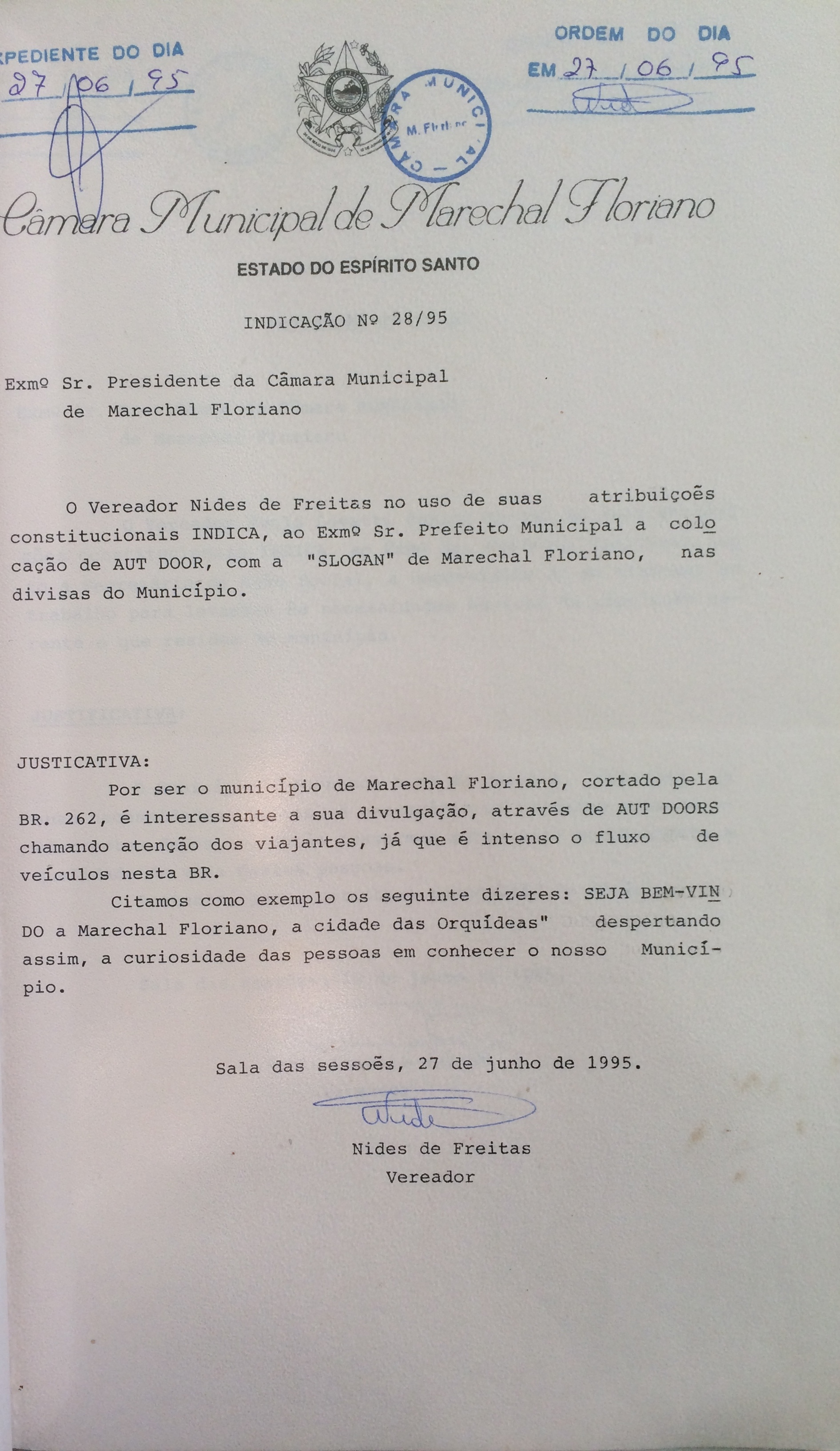 Ementa: INDICA A COLOCAÇÃO DE UM AUT DOOR, COM A "SLOGAN" DE MARECHAL FLORIANO, NAS DIVISAS DO MUNICÍPIO.