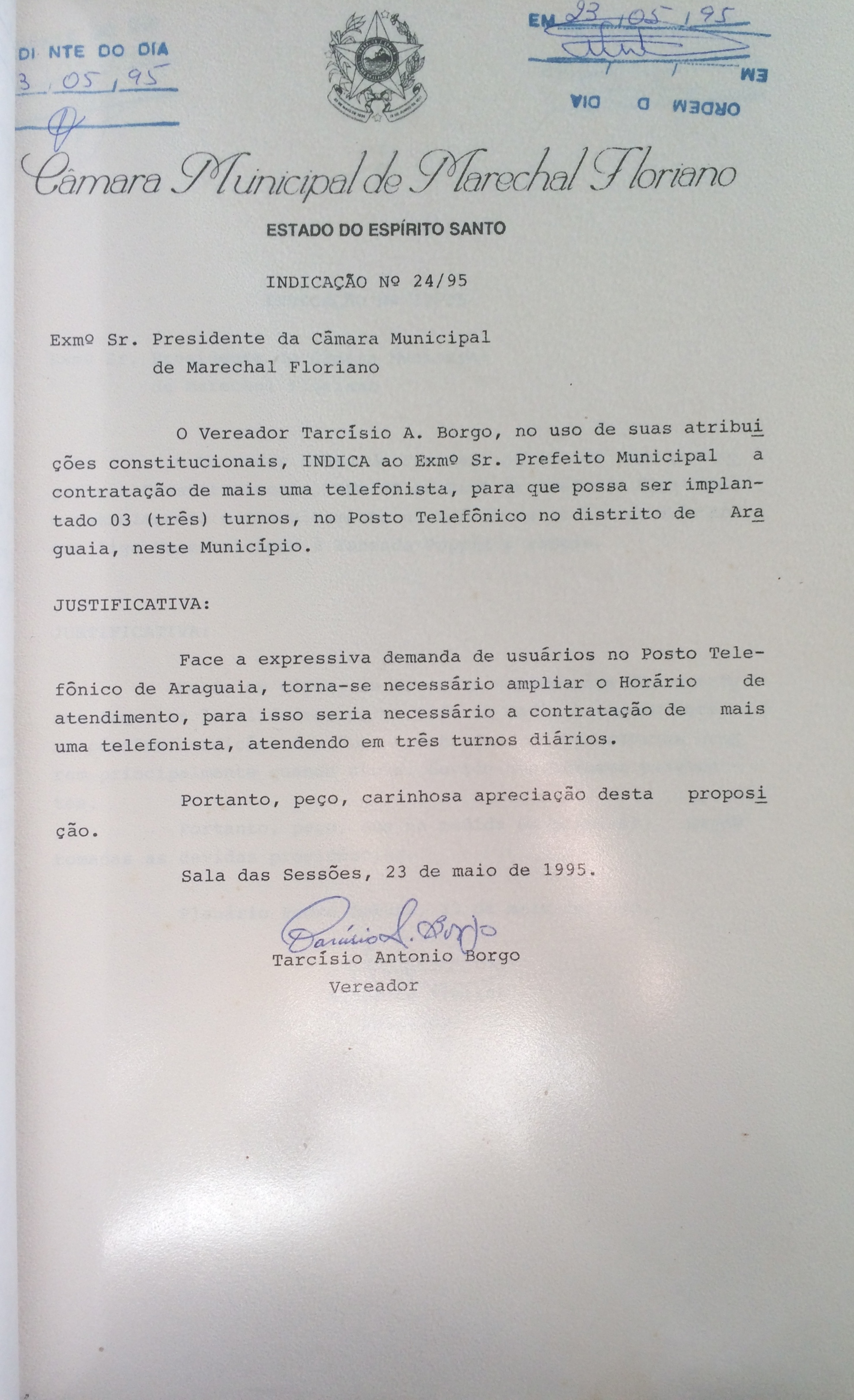 Ementa: INDICA A CONTRATAÇÃO DE MAIS UMA TELEFONISTA, PARA QUE POSSA SER IMPLANTADO EM 03 (TRÊS) TURNOS, NO POSTO TELEFÔNICO NO DISTRITO DE ARAGUAIA, NESTE MUNICÍPIO.