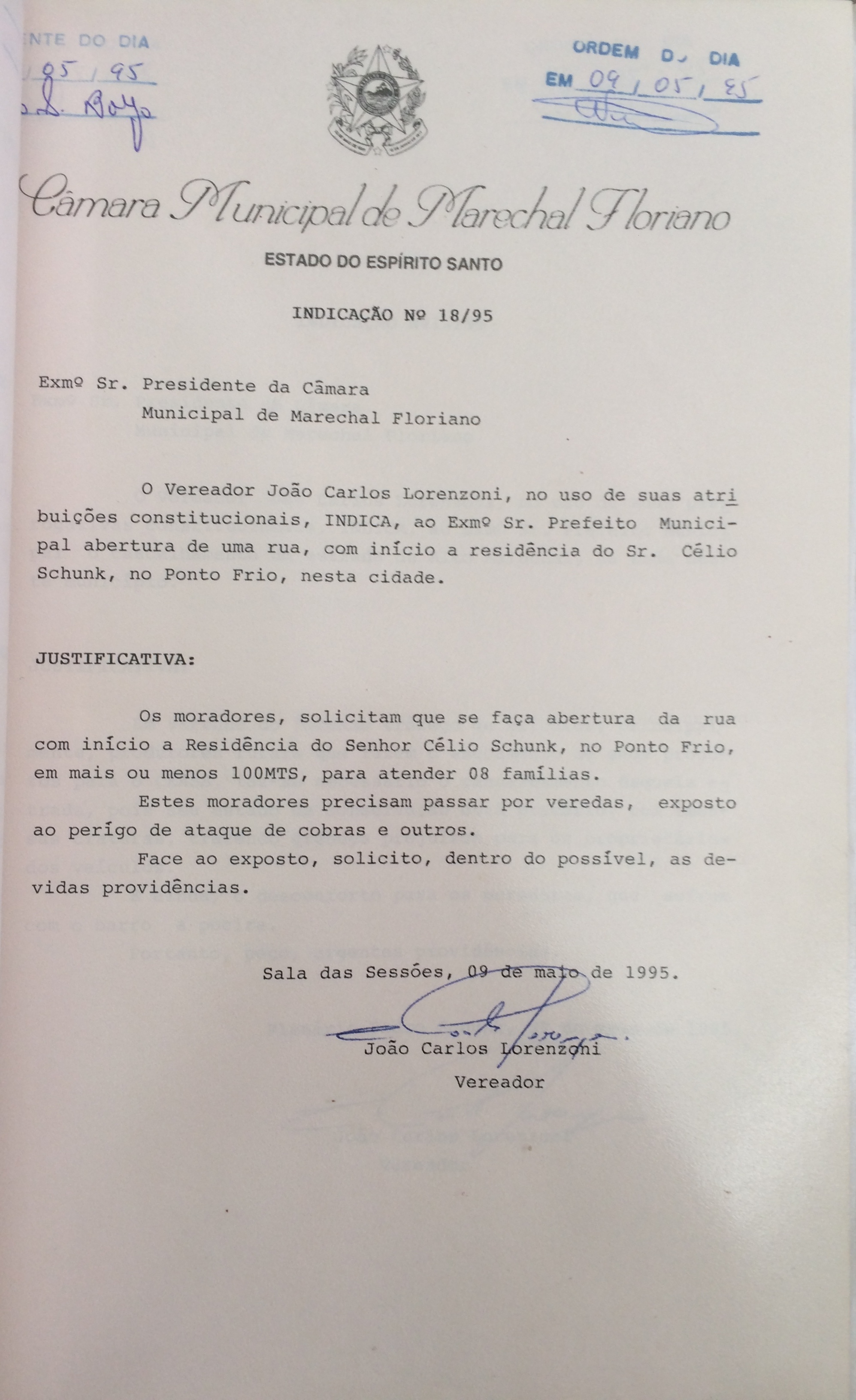Ementa: INDICA ABERTURA DE UMA RUA, COM INICIO A RESIDÊNCIA DO SR. CÉLIO SCHUNK, NO PONTO FRIO, NESTA CIDADE.