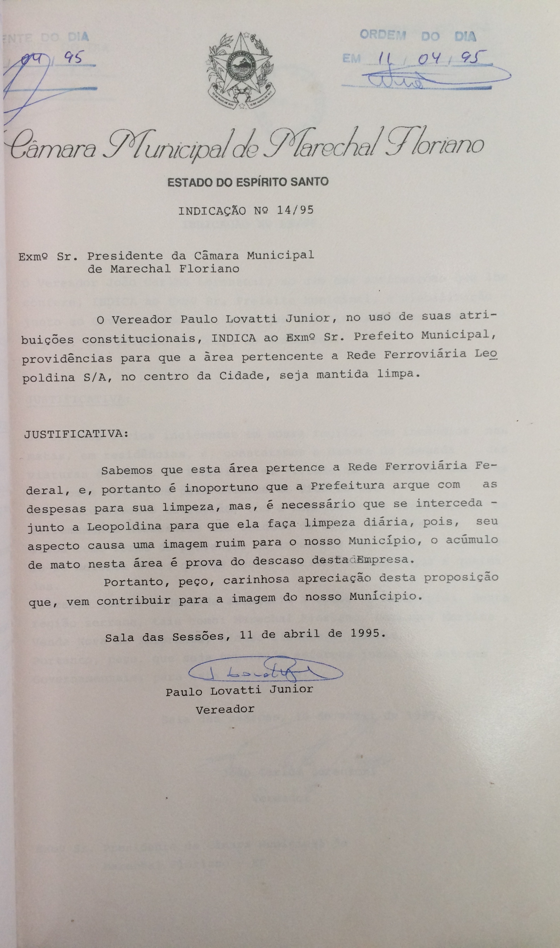 Ementa: INDICA PROVIDÊNCIAS PARA QUE A ÁREA PERTENCENTE A REDE FERROVIÁRIA LEOPOLDINA S/A, NO CENTRO DA CIDADE, SEJA MANTIDA LIMPA.