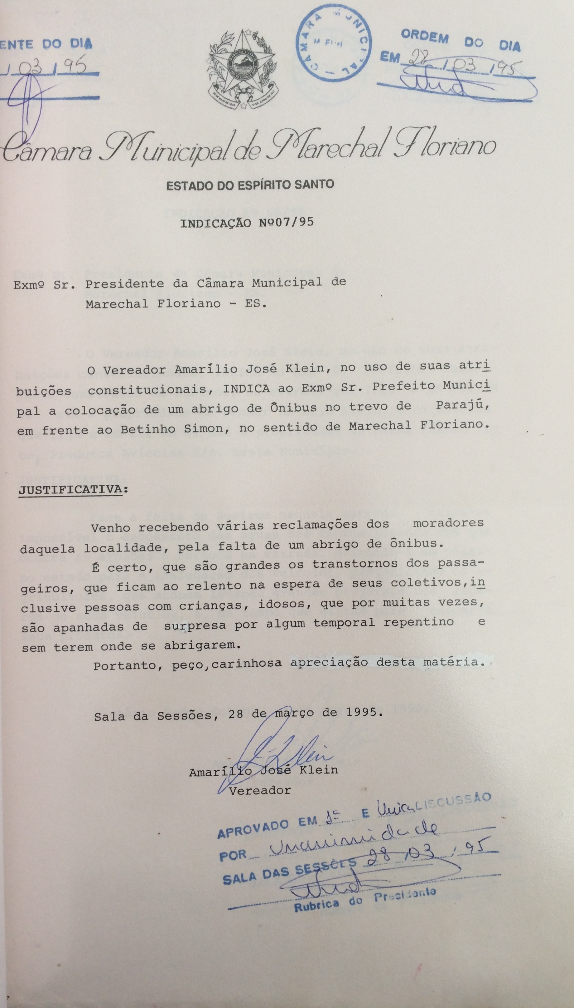 Ementa: INDICA A COLOCAÇÃO DE UM ABRIGO DE ÔNIBUS NO TREVO DE PARAJU, EM FRENTE AO BETINHO SIMON, NO SENTIDO DE MARECHAL FLORIANO.