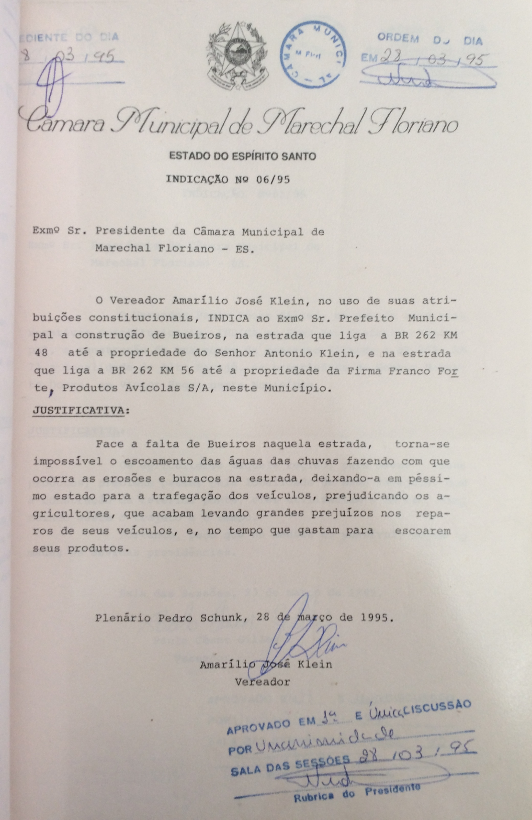Ementa: INDICA A CONSTRUÇÃO DE BUEIROS, NA ESTRADA QUE LIGA A BR 262 KM 48 ATÉ A PROPRIEDADE DO SENHOR ANTONIO KLEIN, E NA ESTRADA QUE LIGA A BR 262 KM 56 ATÉ A PROPRIEDADE DA FIRMA FRANCO FORTE, PRODUTOS AVICOLAS S/A, NESTE MUNICÍPIO.